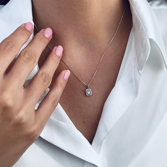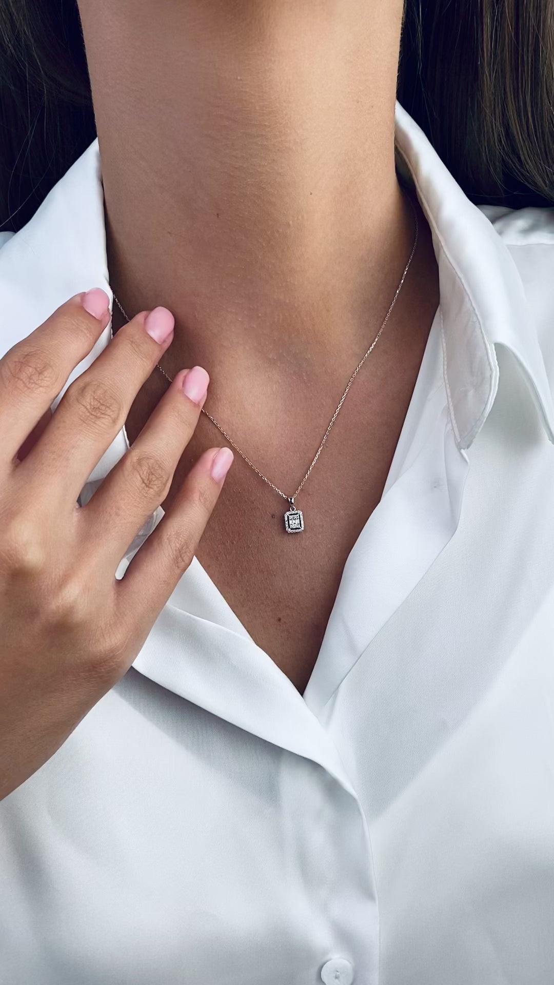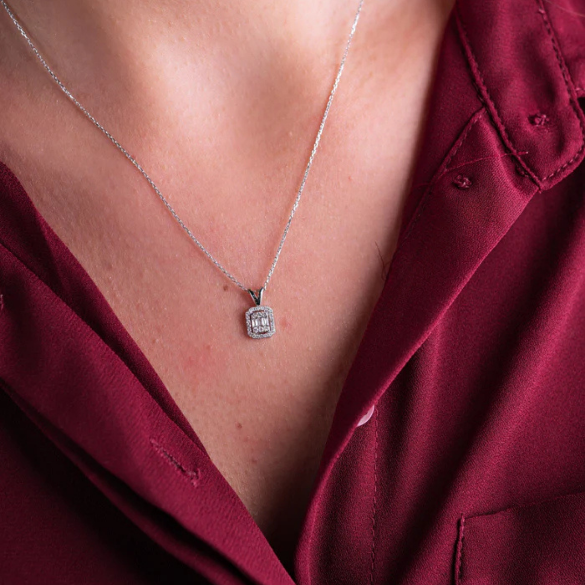 Baget kesim pırlantaların zarif ışıltısıyla tasarlanan bu kolye, klasik ve modern tasarımı bir araya getiriyor. Parlak pırlantalarla süslenmiş merkez taşı, günlük şıklığınıza anlam katan bir dokunuş sunuyor. Kendinizi ya da sevdiklerinizi özel hissettirecek bu kolye, her stile uyum sağlayacak şekilde tasarlandı.