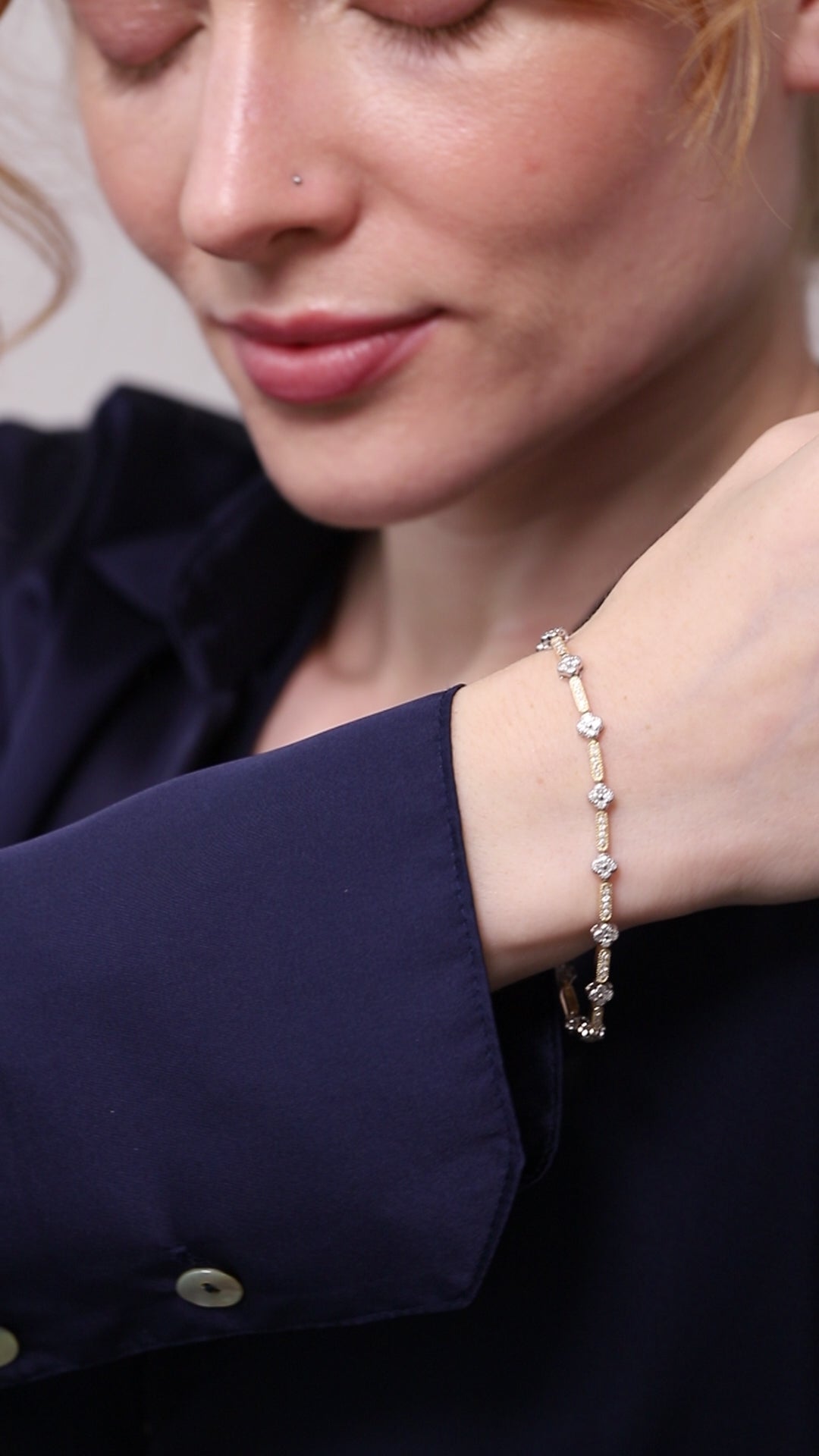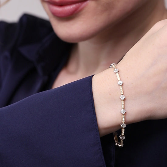 14 Ayar Altın'dan yapılmış 'Altın Düşler Bileklik', zamansız şıklığı ve zarafeti temsil eder. Kombine altın tonlarıyla ve pırlantaların eşsiz parlaklığıyla bu bileklik, özel anlarınıza değer katmak için tasarlanmıştır. Zarif detaylarıyla öne çıkan bu parça, günlük kullanımda stilinize sofistike bir dokunuş katarken, özel davetlerde de dikkat çeken bir mücevher olacaktır. Hem zarif hem de güçlü bir estetiği bir arada sunan bu bileklik, her koleksiyona incelik katacak bir tercih.
