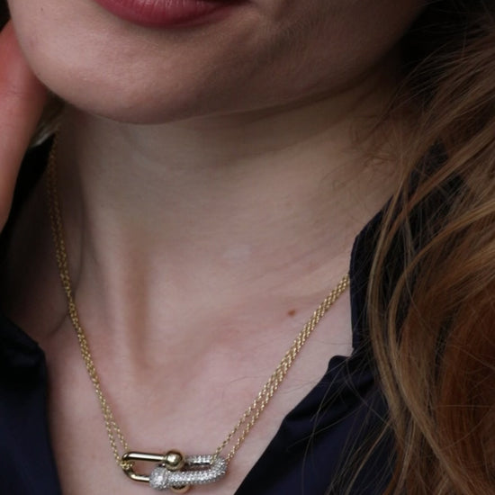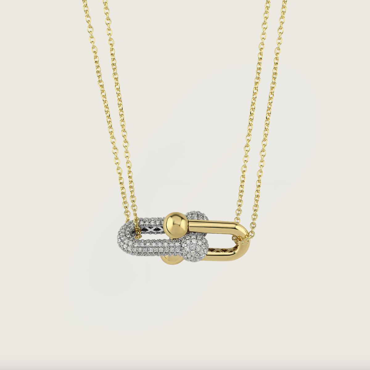 Kilit bağlantı detaylarıyla modern ve özgün bir tasarıma sahip bu pırlanta kolye, zarafeti ve şıklığı bir araya getiriyor. Pırlantaların ışıltısını altınla buluşturan bu özel parça, hem günlük kombinlerinizi tamamlamak hem de özel davetlerde dikkat çekmek için ideal bir tercihtir.