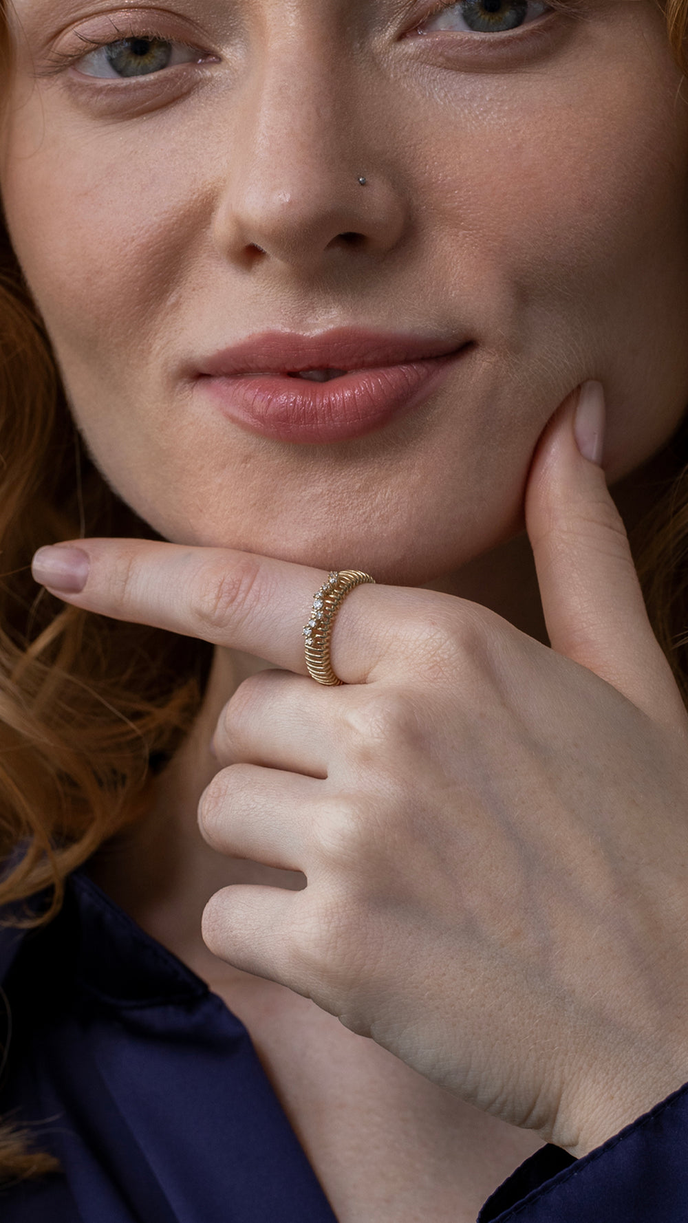 Altın Rüzgar Pırlanta Yüzük, kıvrımlı altın detayları ve üzerindeki pırlantalarla şıklığı ve zarafeti bir araya getiriyor. Doğal altın rengi ve ışıltılı pırlantalarıyla bu yüzük, hem gündelik hayatta hem de özel anlarınızda stilinizi tamamlayacak. Klasik ve modern tasarımın mükemmel uyumunu yansıtan bu yüzük, sevdiklerinize ya da kendinize verebileceğiniz unutulmaz bir hediye olacak.