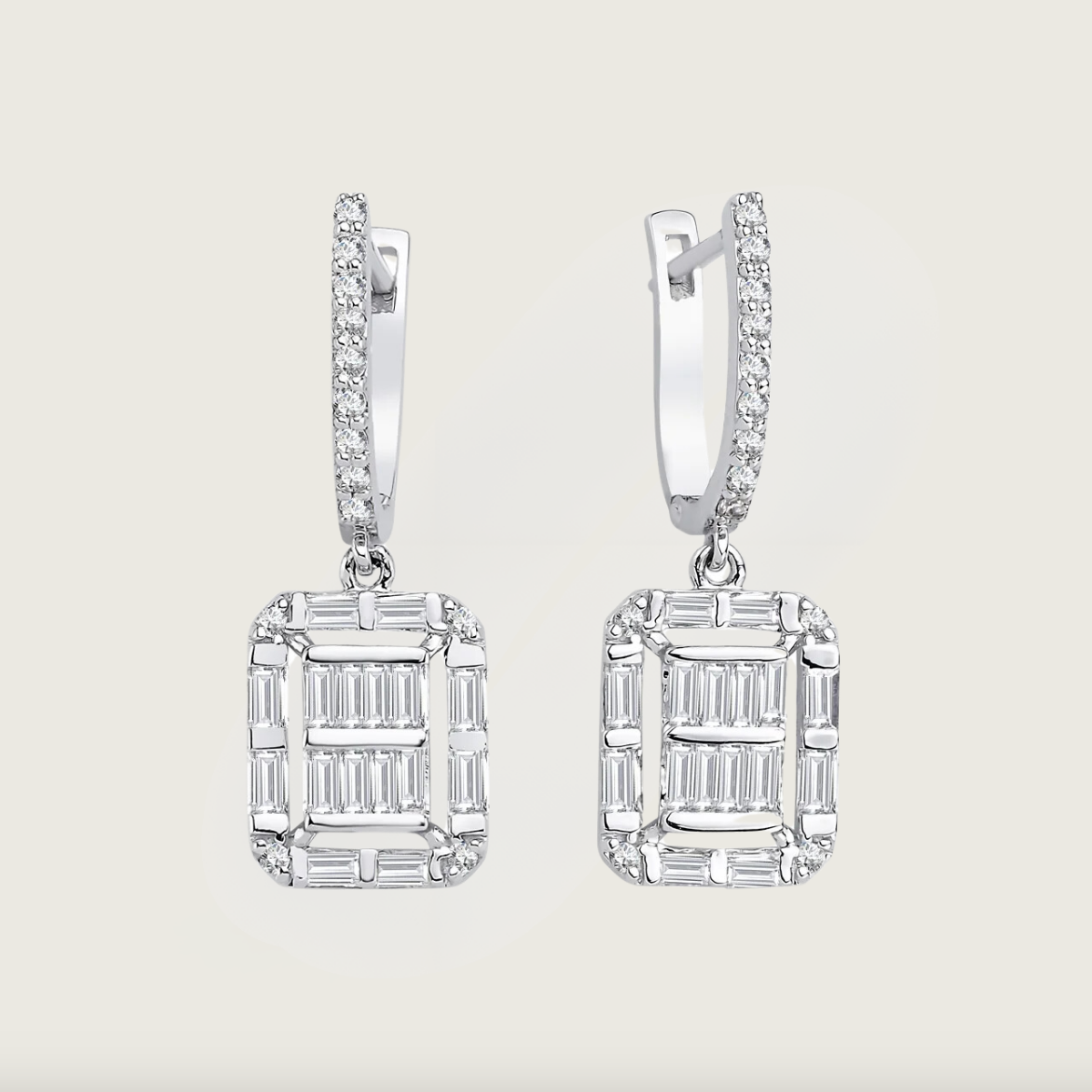 Dikdörtgen hatları ve baget pırlanta yerleşimiyle göz kamaştıran bu küpe, 14 Ayar beyaz altından yapılmış ve her hareketinizde ışıltı saçan zarif bir parça sunar.