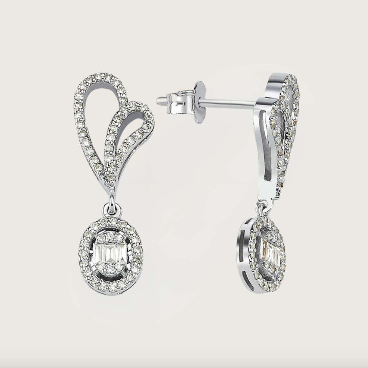 Kalp motiflerinin zarafeti ve pırlantaların göz kamaştırıcı parlaklığıyla tasarlanmış bu 14 ayar beyaz altın küpeler, her dokunuşta aşkın ışıltısını yansıtır. Baguette kesim pırlantalarla süslenmiş detaylar, romantizmi ve sofistikeyi mükemmel bir şekilde bir araya getirir. Her anınıza şıklık ve anlam katacak bu küpeler, zarif tarzınızı tamamlamaya hazır. Aşkı ve zarafeti simgeleyen bu özel tasarım, her kadının mücevher koleksiyonunda vazgeçilmez bir parça olacak.
