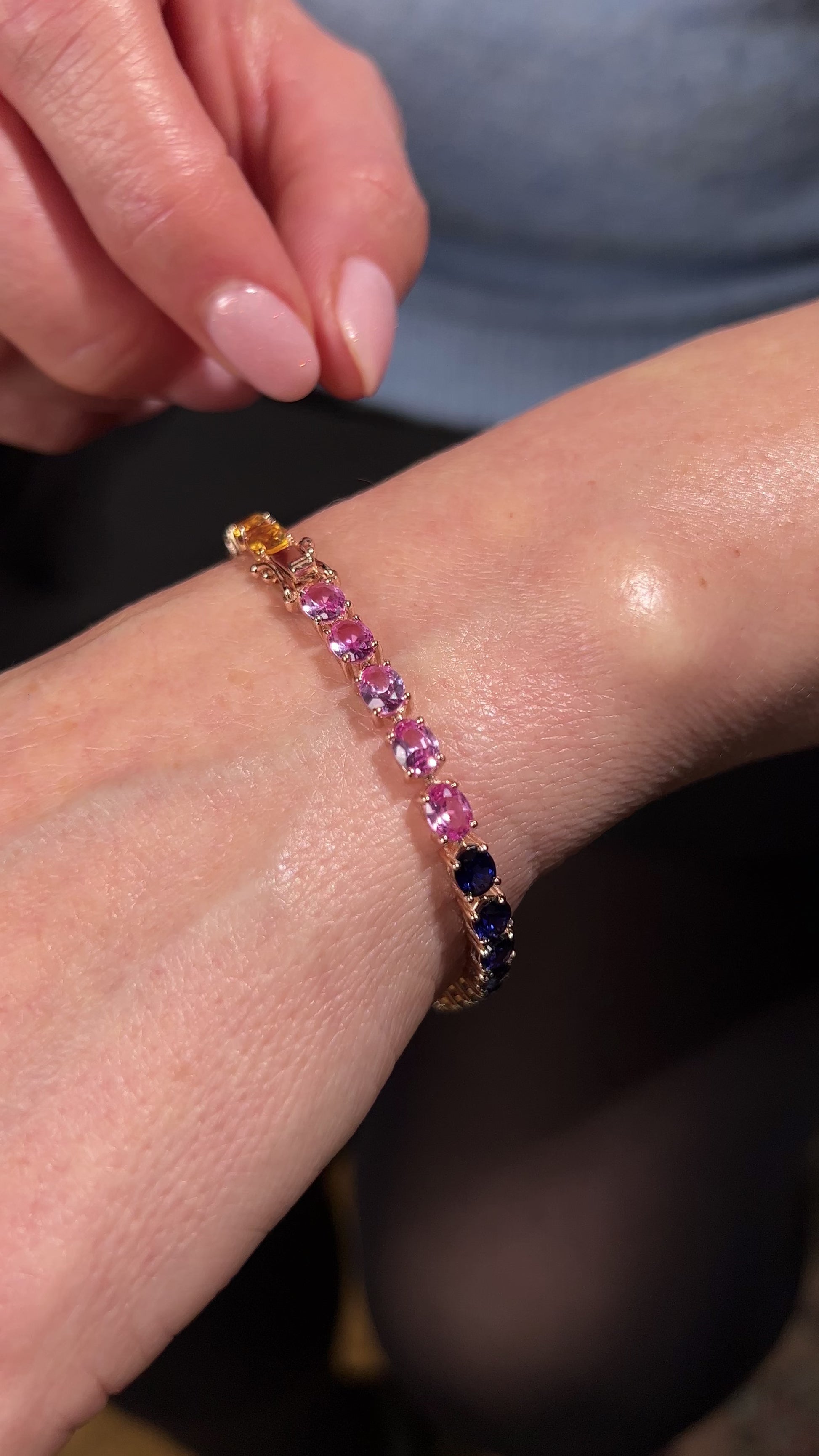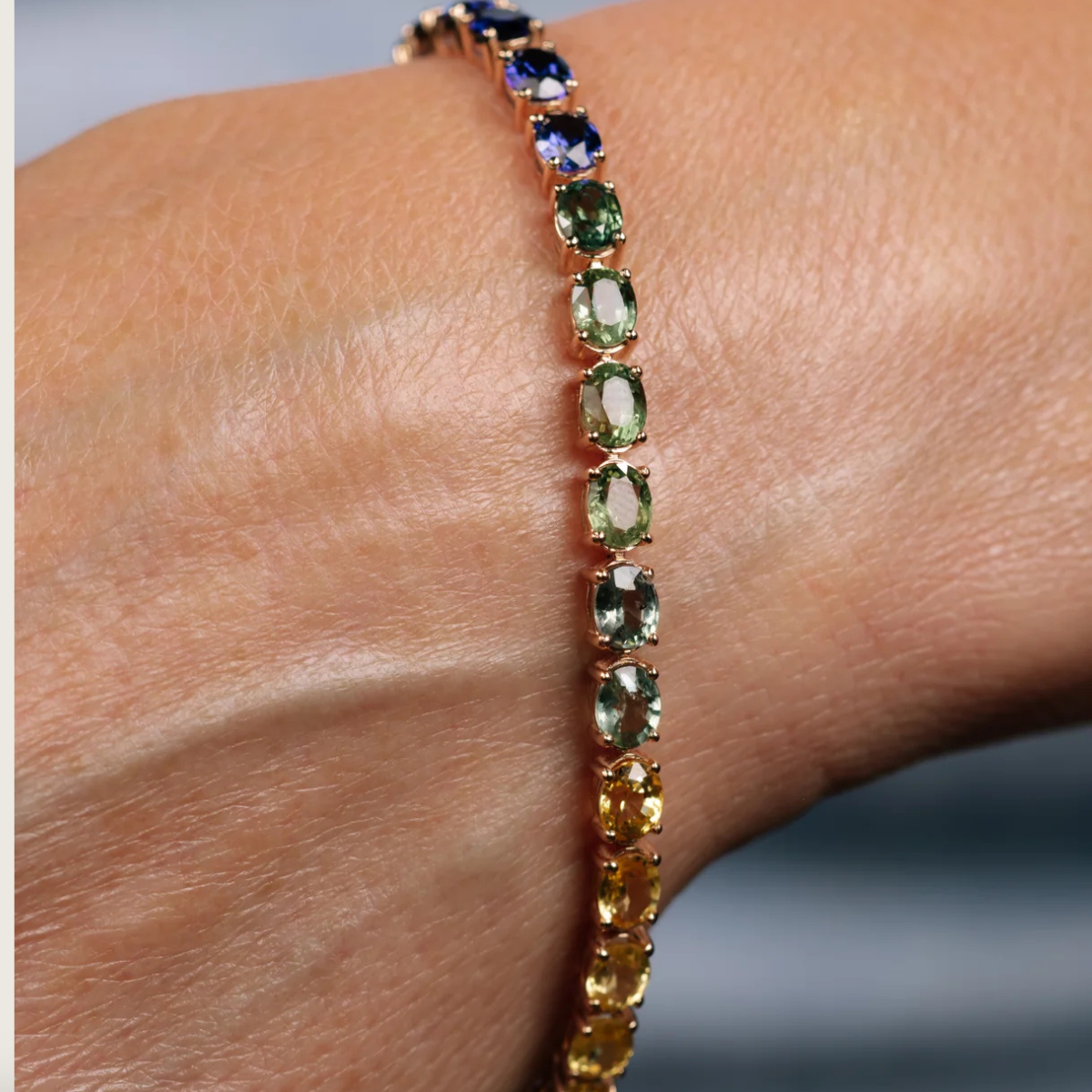 Renklerin dansını bileğinizde hissedin! Aurora'nın gökyüzündeki büyüleyici renklerinden ilham alan bu çok renkli safirlerle bezenmiş zarif pembe altın bileklik, her adımınızda ışıldayan bir zarafet sunar. 14 ayar pembe altınla işlenmiş olan bu tasarım, size hem günlük hayatta hem de özel günlerde sofistike bir şıklık katacak. Her bir safir taşının eşsizliği ve dikkat çekici renk geçişleri, bu bilekliği sadece bir aksesuar değil, adeta bir sanat eseri haline getiriyor.