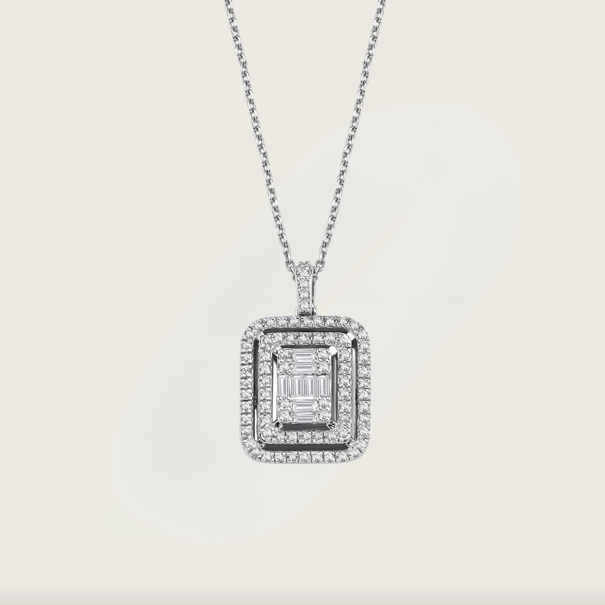 Bu zarif kolye, 14 ayar beyaz altın üzerine ince bir işçilikle yerleştirilmiş baget ve yuvarlak kesim pırlantalar ile tamamlanmıştır. Dikdörtgen formdaki bu tasarım, modern ve lüks bir görünüm sunarak her anınıza ışıltı katacak. Göz alıcı yapısı ve benzersiz montürü sayesinde, özel günlerde stilinize sofistike bir dokunuş yaparak fark yaratmanızı sağlar.