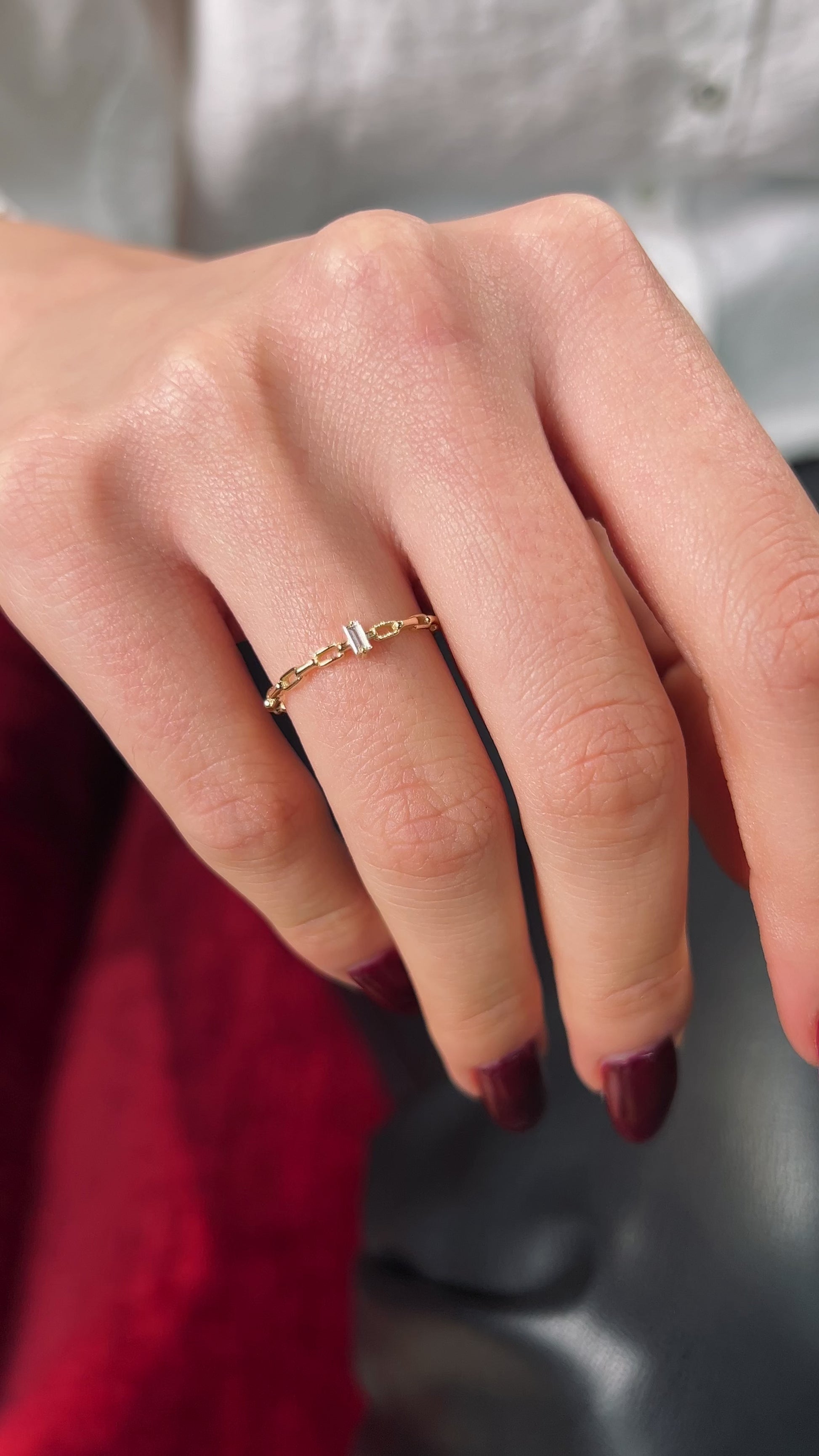İnce ve zarif zincir formu, baget kesim pırlanta ile buluşarak eşsiz bir parıltı sunar. Bu özel tasarım, hem günlük kullanıma hem de özel günlerdeki zarif kombinlerinizi tamamlayacak şekilde tasarlanmıştır.