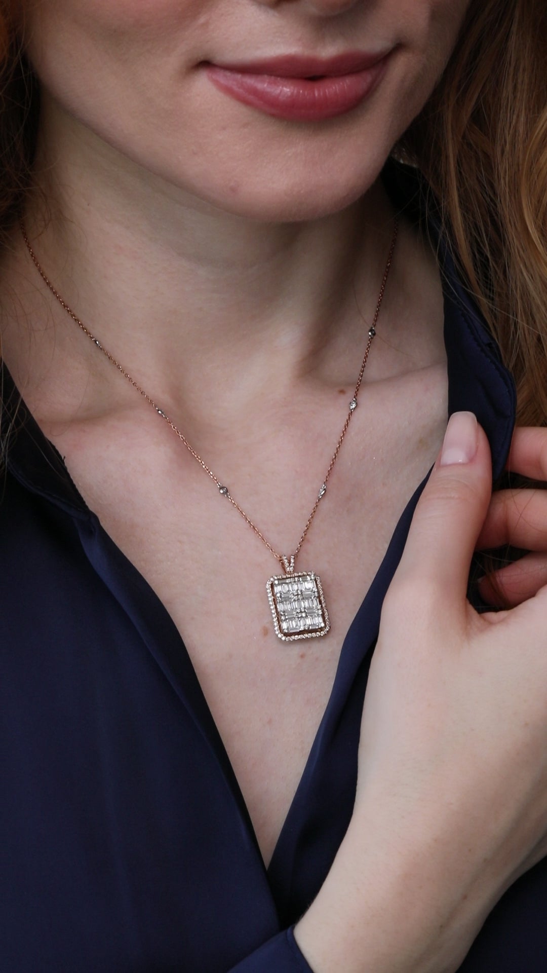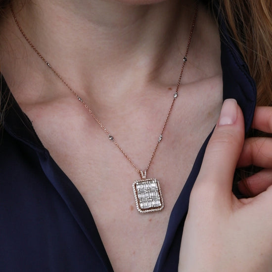 Baget Işıltısı Pırlanta Kolye, lüks ve zarafeti bir araya getiriyor. Modern tasarımı ve dikkat çekici baget pırlantalarıyla öne çıkan bu kolye, her detayıyla şıklığınızı tamamlıyor. Gümüş ve rose altın kombinasyonu, bu parıltılı parçada zarif bir denge oluşturuyor.
