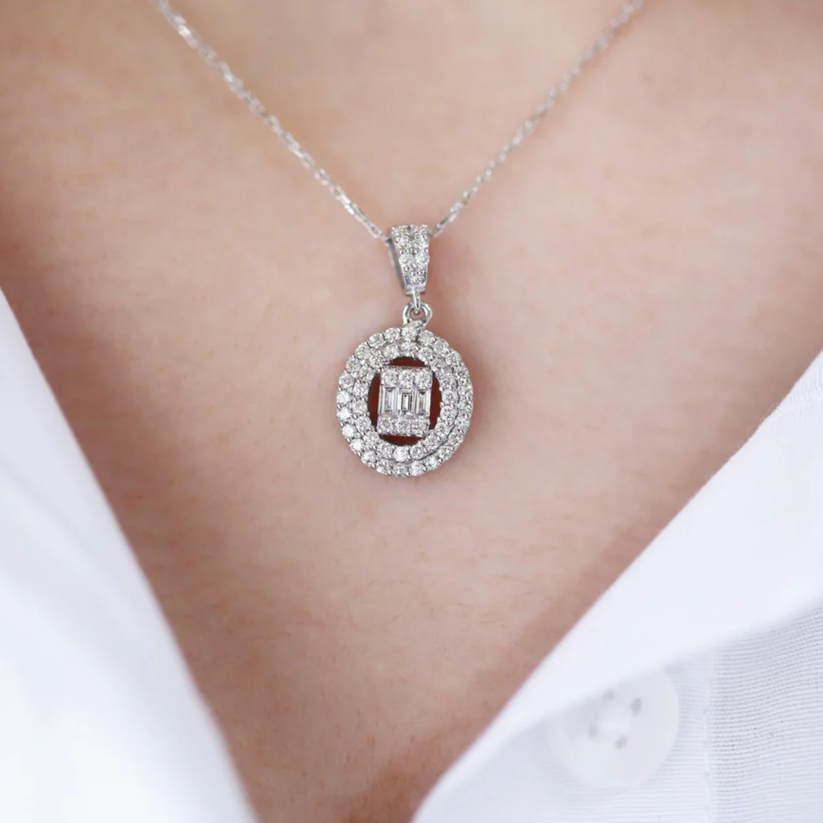 Baget kesim pırlantaların zarif uyumuyla şekillenen bu yuvarlak kolye, stilinize sofistike ve ışıltılı bir dokunuş katıyor. Özenle tasarlanan bu parça, günlük kombinlerinizi tamamlayacak ve özel anlarınıza eşlik edecek şık bir tercih sunuyor. Hem kendinizi ödüllendirmek hem de sevdiklerinize unutulmaz bir hediye vermek için ideal bir seçim olabilir.