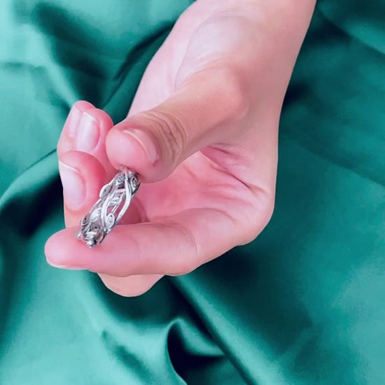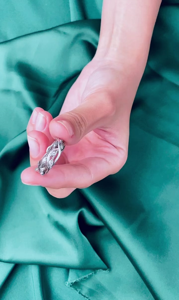 Beyaz altın ile tasarlanan bu yüzük, yaprak motifleri ve pırlanta detaylarıyla zarafeti bir araya getirir. Doğadan ilham alan ince yaprak figürleri, yüzüğe hafif ve zarif bir estetik kazandırırken, pırlantalarla süslenmiş detaylar şıklığınızı tamamlar. Modern ve sofistike bir tasarıma sahip bu yüzük, hem günlük stilinizi yükseltmek hem de özel günlerinizde fark yaratmak için mükemmel bir seçimdir. Doğallığı ve ışıltıyı bir arada sunan bu tasarım, her tarza uyum sağlar.