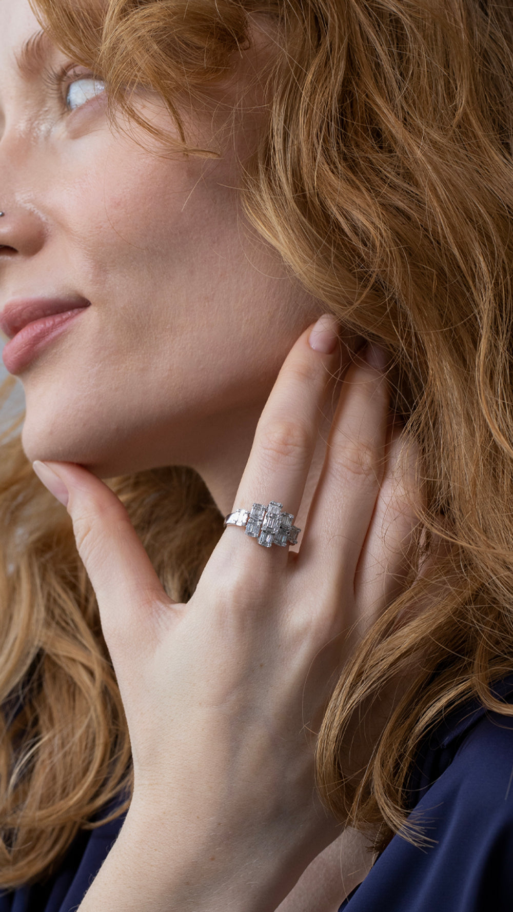 Şık ve sofistike bir görünüm sunan bu beyaz altın yüzük, farklı kesim ve boyutlardaki baget ve yuvarlak pırlantalarla dikkat çekiyor. Pırlantaların dikkatlice yerleştirilmesi, yüzüğe hem modern hem de zarif bir hava katıyor. Özel tasarımıyla ışığı mükemmel şekilde yansıtan bu yüzük, hem özel anlarınızda hem de günlük hayatınızda zarafetinizi ön plana çıkaracak. Göz alıcı pırlantalarla bezenmiş bu yüzük, beyaz altının parlaklığıyla birleşerek mükemmel bir uyum sunuyor.