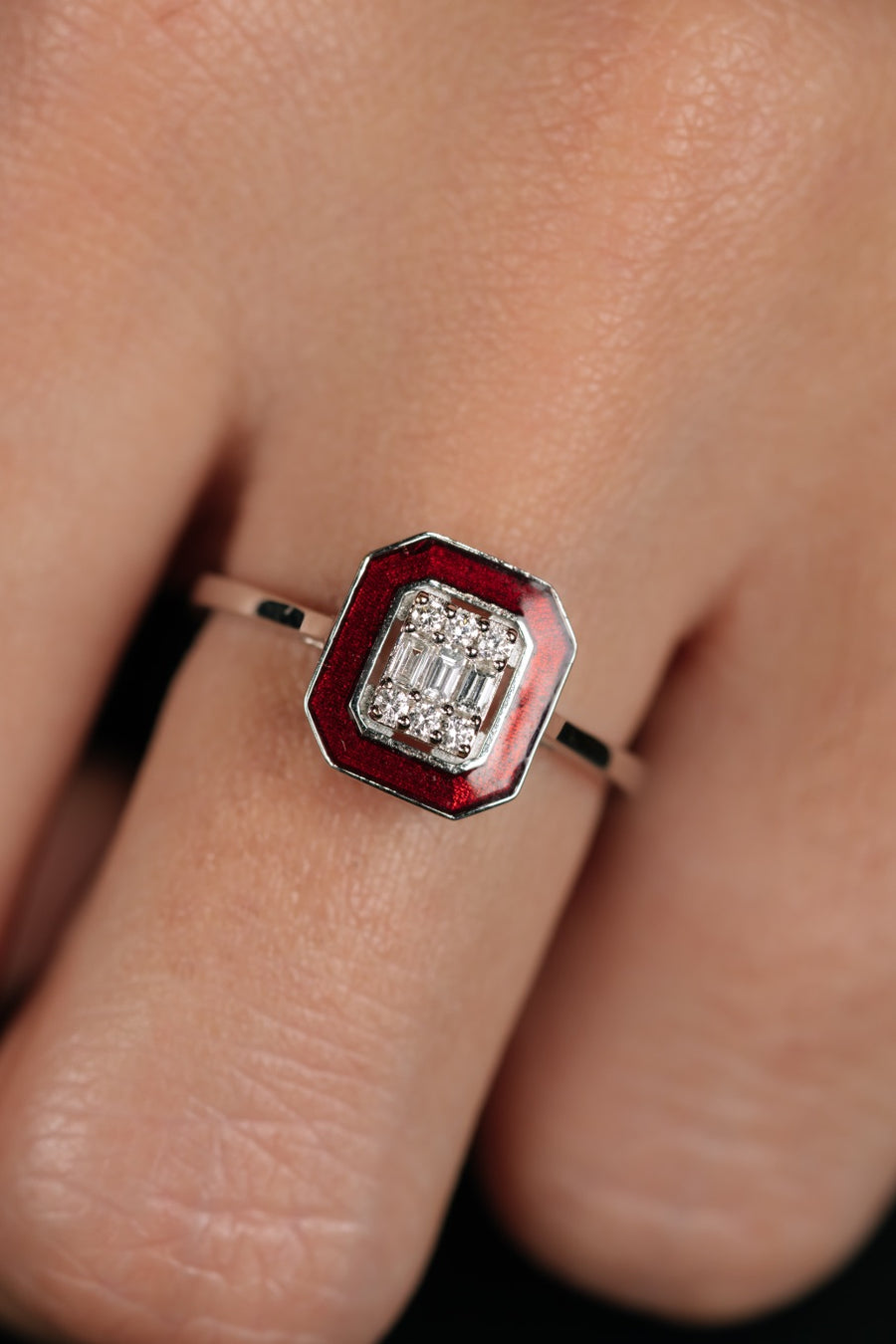 Her detayıyla özenle işlenen bu yüzük, tarih ve sanatın modern çizgilerde buluşmasını sevenler için tasarlandı. Bordo minesi ve pırlantanın parlaklığı, günümüz stiline tarihsel bir dokunuş katarken, sofistike bir şıklık sunuyor. Klasik ile moderni bir araya getiren bu özel parça, unutulmaz anlarınızı taçlandıracak nadir bir mücevher.