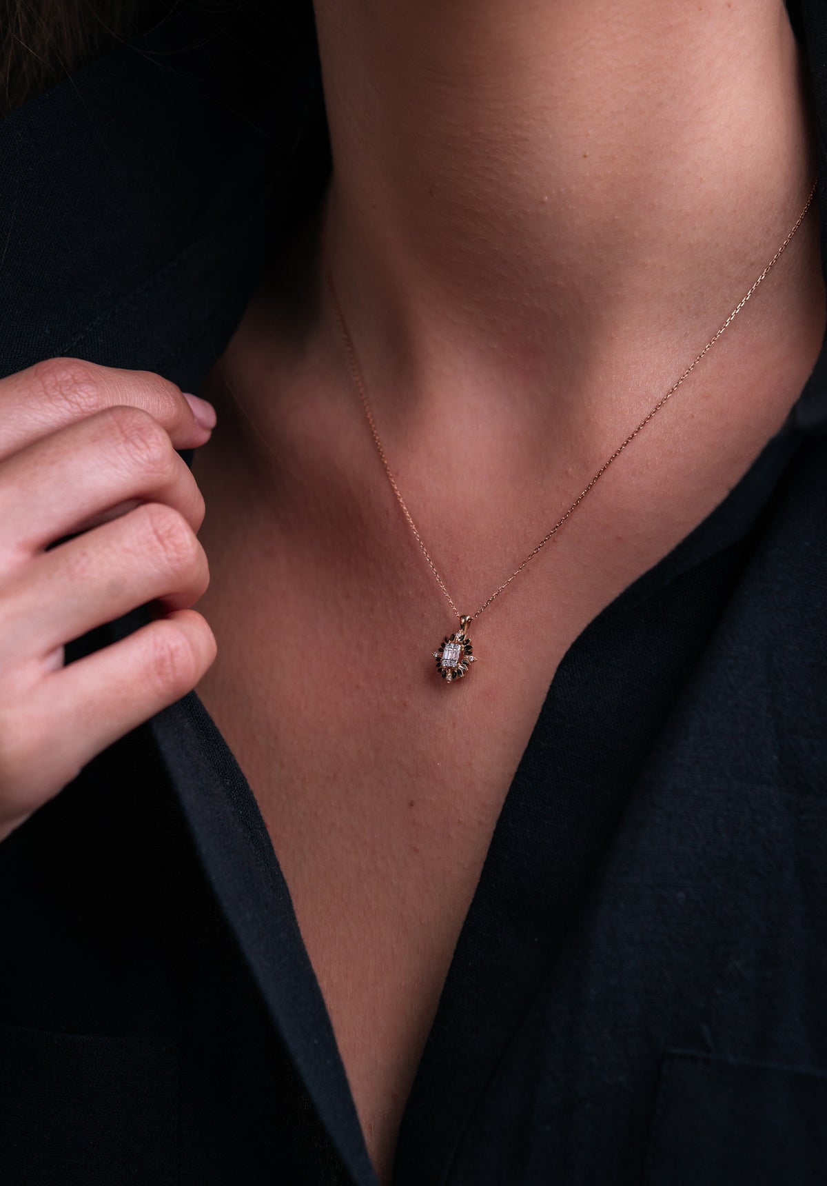 Rose altının sıcak tonları ile baget kesim pırlantanın zarif ışıltısını buluşturan bu özel kolye, göz alıcı tasarımıyla dikkat çekiyor. Parlak pırlantalarla çevrelenen merkez taşı, günlük şıklığınızı tamamlayacak sofistike bir dokunuş sunuyor. Kendinizi ya da sevdiklerinizi bu benzersiz tasarımla ifade etmek için ideal bir seçim.