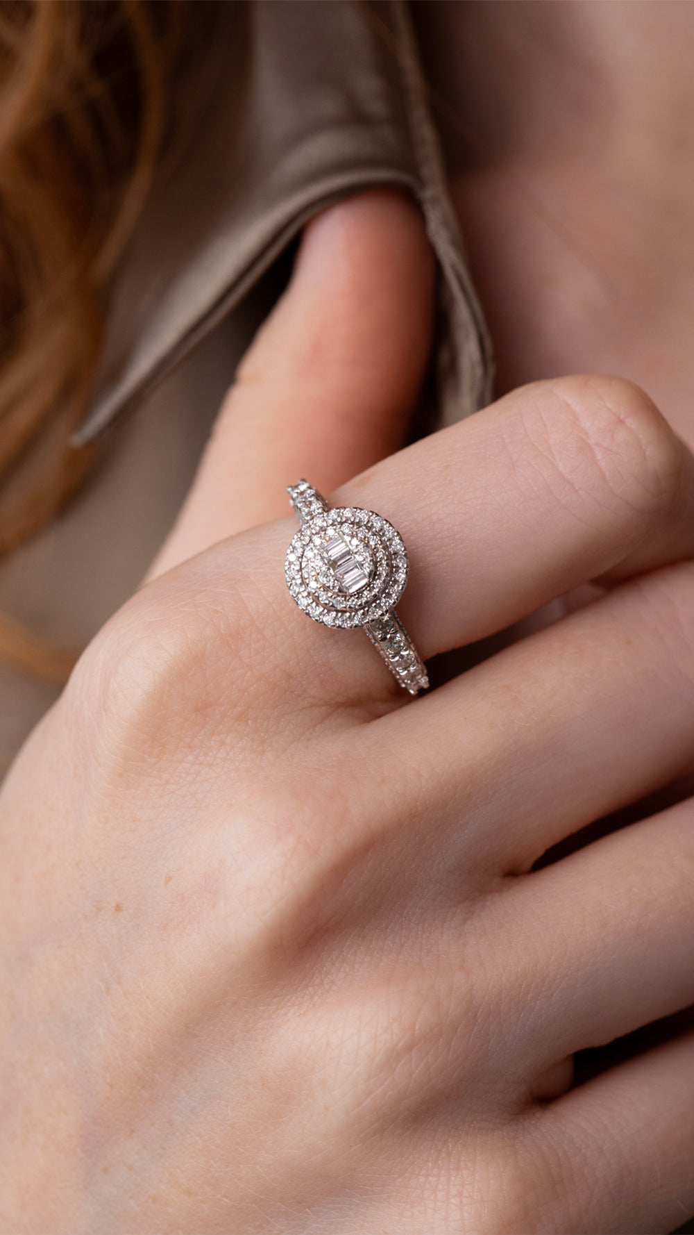 Çift Sıra Oval Baget Pırlantalı Beyaz Altın Yüzük
