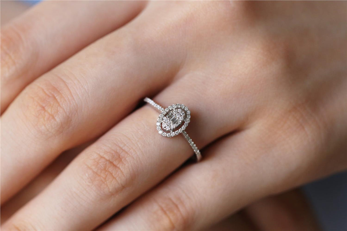 Oval formda dizayn edilmiş bu yüzüğün merkezindeki baget kesim pırlanta, çevresini saran ince pırlantalarla adeta bir ışık halkası oluşturur. Hem zarif hem de göz alıcı olan bu yüzük, sadelikten vazgeçmeyen, ancak parıltısını da her an yanına almak isteyenler için ideal bir tercihtir. Her açıdan farklı bir ışıltı sunan bu tasarım, özel günlerinize ve günlük şıklığınıza sofistike bir dokunuş katarken, zamansız yapısıyla her daim parmağınızda kalacak bir mücevherdir. Oval şeklin verdiği yumuşak hatlar, yüzüğe romantik bir hava katarken, baget pırlantanın keskin detayları göz alıcı bir kontrast sunar.