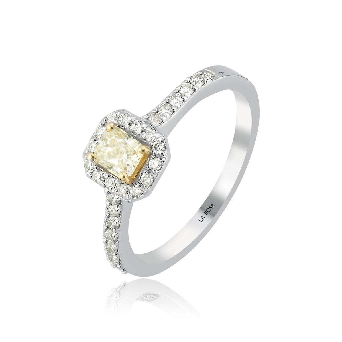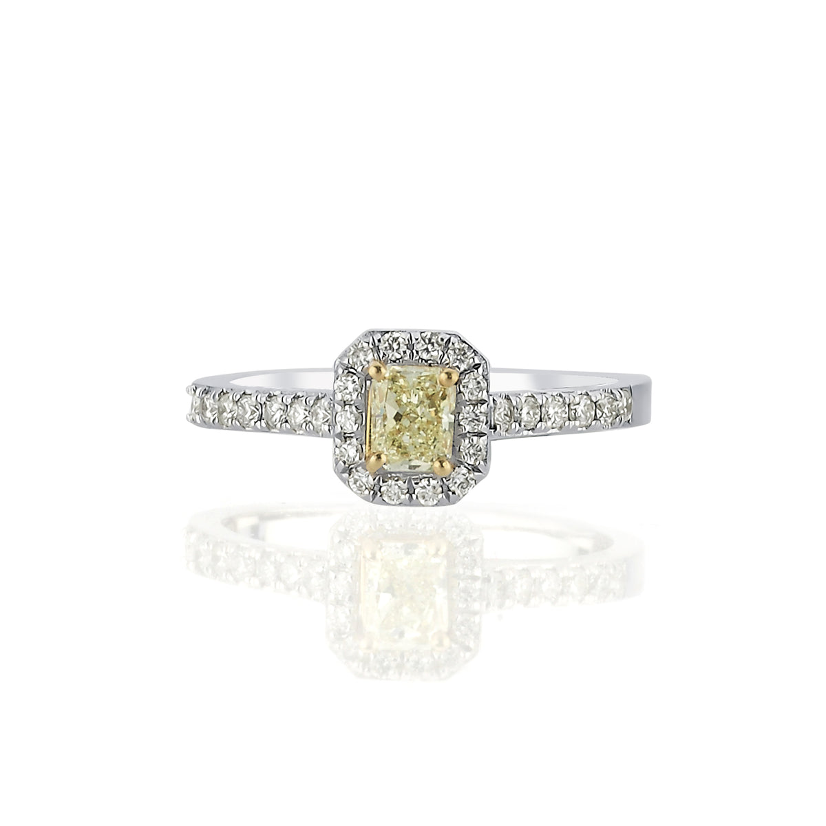 Bu özel tasarım yüzük, merkezinde yer alan 0,14 karatlık fancy sarı pırlantası ile benzersiz bir ışıltıya sahiptir. Sarı tonlardaki bu nadir pırlanta, çevresindeki parlak beyaz pırlantalarla tamamlanarak göz alıcı bir kontrast oluşturur. Beyaz altın üzerine yerleştirilmiş bu şık tasarım, modern zarafeti ve sofistike duruşu ile her anınıza ışıltı katmaya hazır.