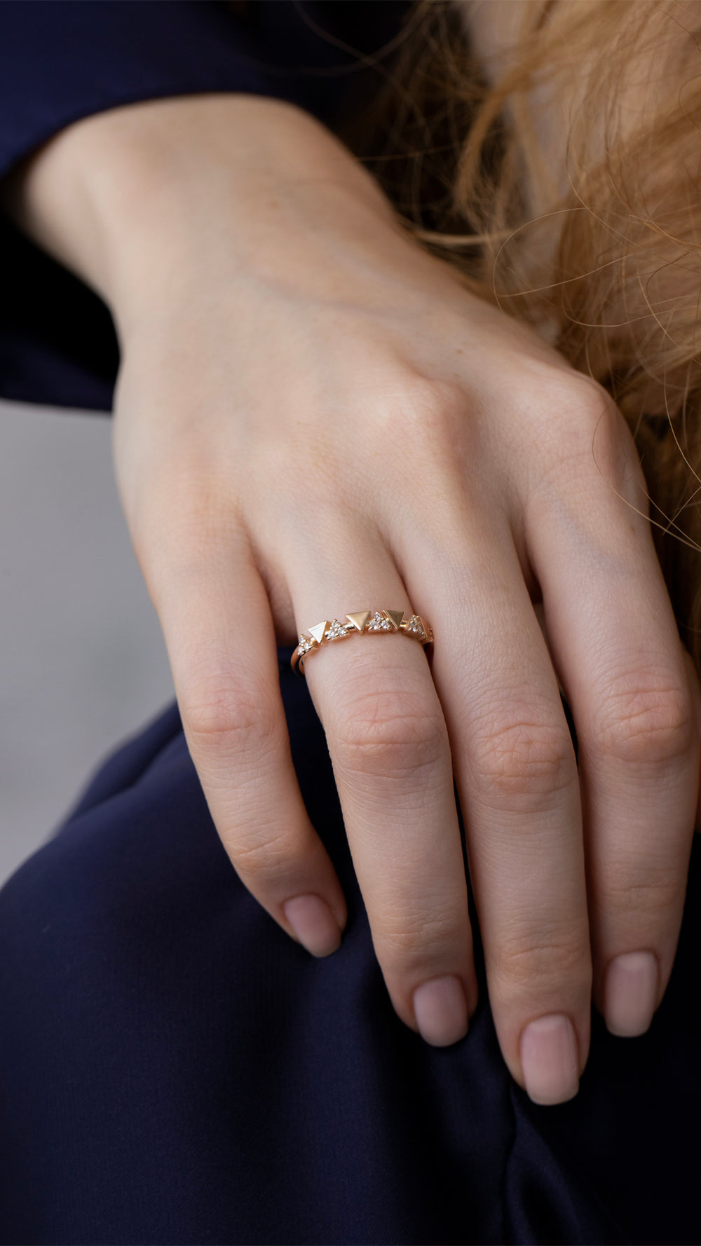 Modern ve cesur tasarımıyla dikkat çeken Geometrik 5 Taşlı Pırlanta Yüzük, beş taşın zarif bir şekilde sıralandığı rose altın bant üzerinde ışıldıyor. Üçgen formlar ve pırlanta detayları, yüzüğe çağdaş bir hava katarak hem özel günlerinizde hem de günlük stilinizde fark yaratacak bir şıklık sunuyor. Hem zarif hem de dikkat çekici bu tasarım, şıklığı ve modern çizgileri bir arada sunarak stilinize sofistike bir dokunuş katacak.