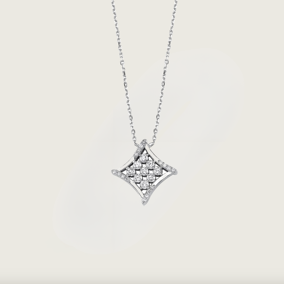 Bu şık pırlanta kolye, geometrik tasarımı ve modern hatlarıyla dikkat çeker. İç içe geçmiş şekillerin zarif düzenlemesi, kolyenin merkezindeki pırlantaları ön plana çıkararak benzersiz bir ışık yayar.