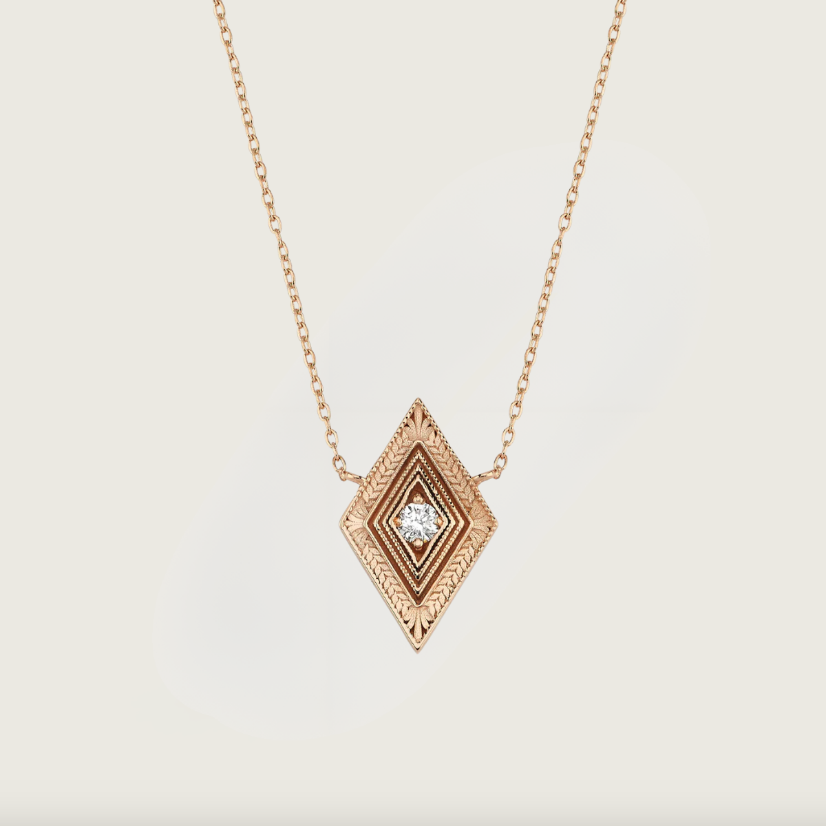 Eşsiz geometrik deseni ve rose altın dokusuyla bu pırlanta kolye, tarzınıza modern bir dokunuş katıyor. Merkezde yer alan pırlanta, zarif ve ince işçilikle detaylandırılmış çerçevesiyle birlikte göz alıcı bir parlaklık sunar. Günlük kombinlerinizden özel davetlerinize kadar her anınıza uyum sağlayacak bu kolye, zarafeti ve modern çizgileri bir araya getiriyor.