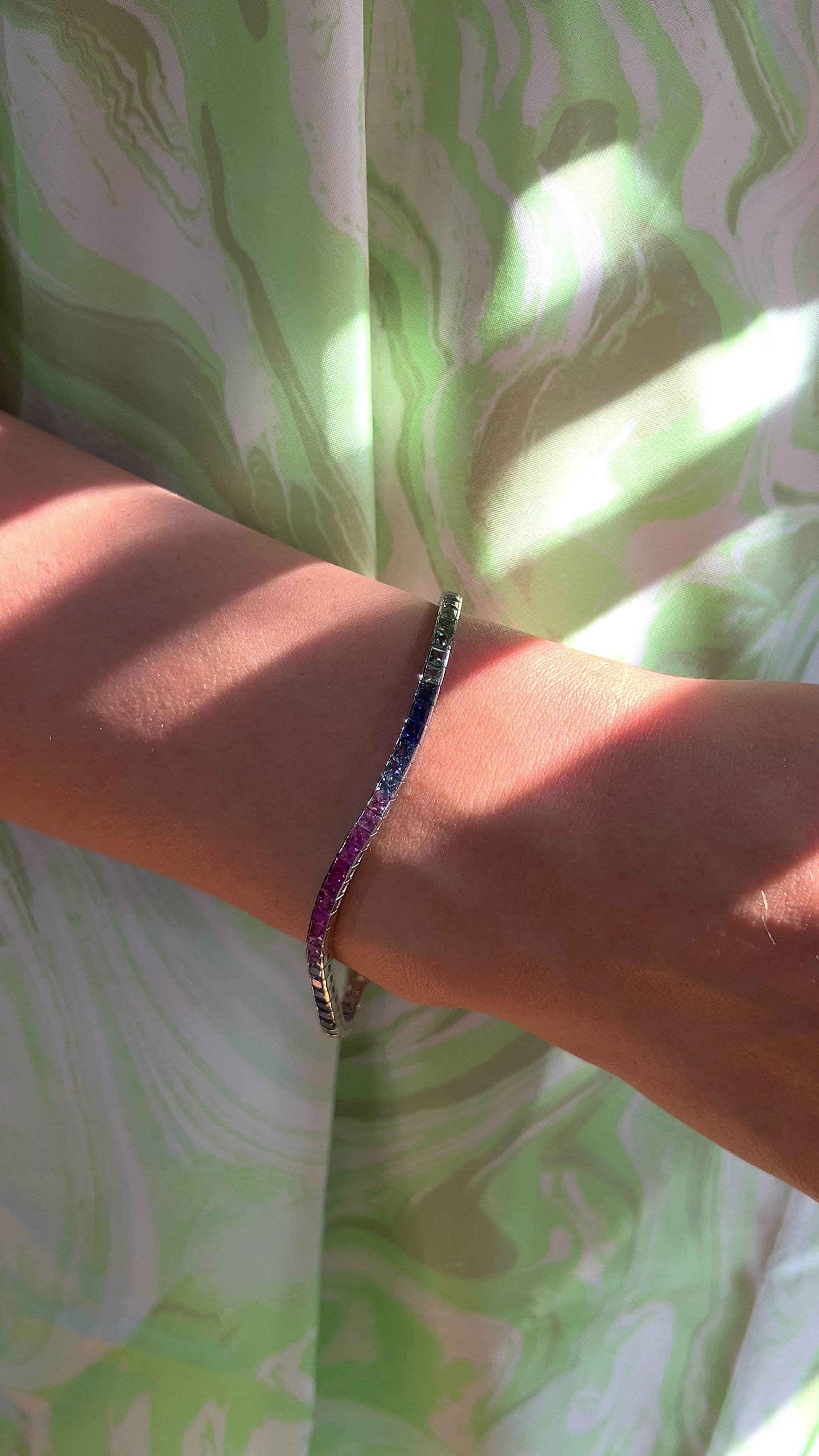 Bu eşsiz 14 ayar beyaz altın bileklik, çok renkli ametist ve değerli taşlardan oluşan büyüleyici bir parça. Prenses kesim taşları ile bileğinize zarif ve modern bir hava katıyor. Gökkuşağının ışıltısını andıran bu bileklik, her mevsim ve tarzla uyum sağlayacak sofistike bir tasarıma sahip.