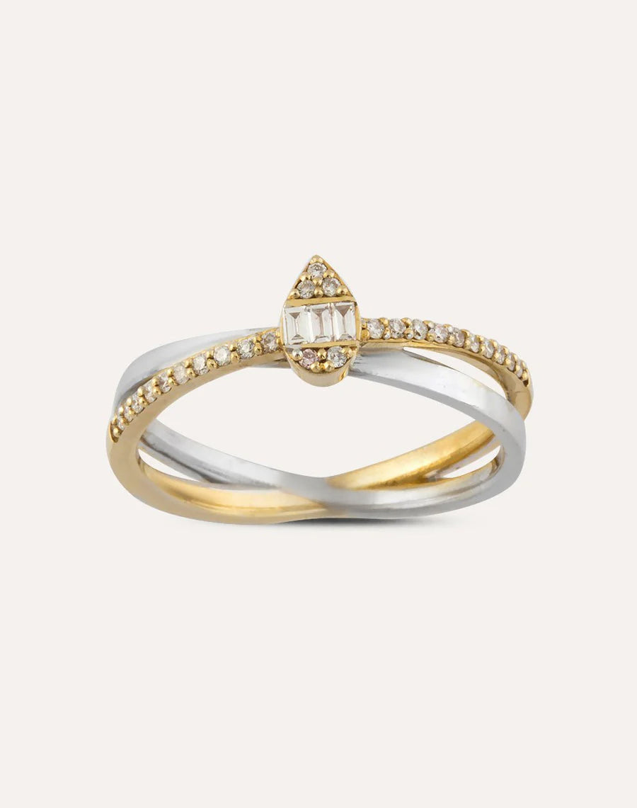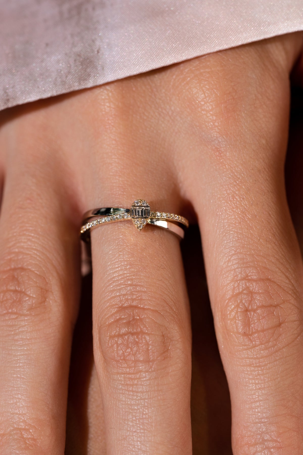 Golden Drop Baget Pırlanta Yüzük, adını aldığı damla formundaki baget pırlanta ile dikkat çeker. Beyaz ve sarı altının uyumlu birleşimi, yüzüğe hem klasik hem de modern bir hava katar. İnce işçiliği ve zarif hatlarıyla bu yüzük, parmağınızda adeta bir mücevher damlası taşır.