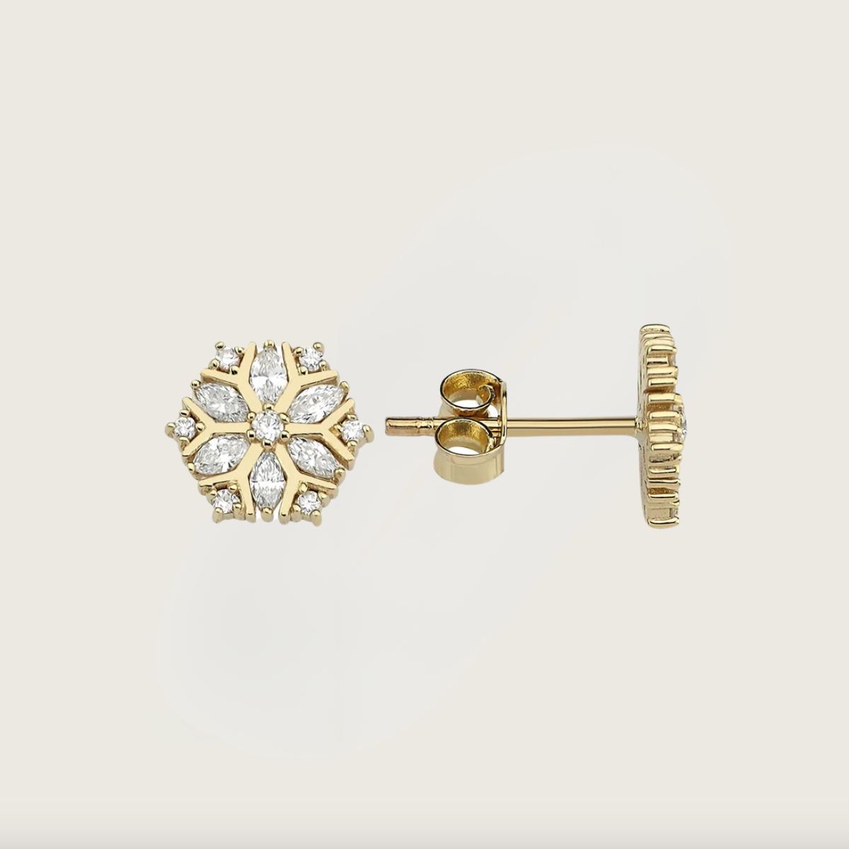 Golden Snow Pırlanta Küpe, zarif kar tanesi formunda tasarlanmış olup 14 ayar sarı altından üretilmiştir. Bu eşsiz tasarım, marquise kesim pırlantaların ince işçiliğiyle birleşerek doğal zarafeti gözler önüne seriyor. Günlük şıklığınıza zarif bir dokunuş katacak olan çivili küpeler, özel davetlerden günlük kullanıma kadar her anınıza sofistike bir ışıltı katacaktır.