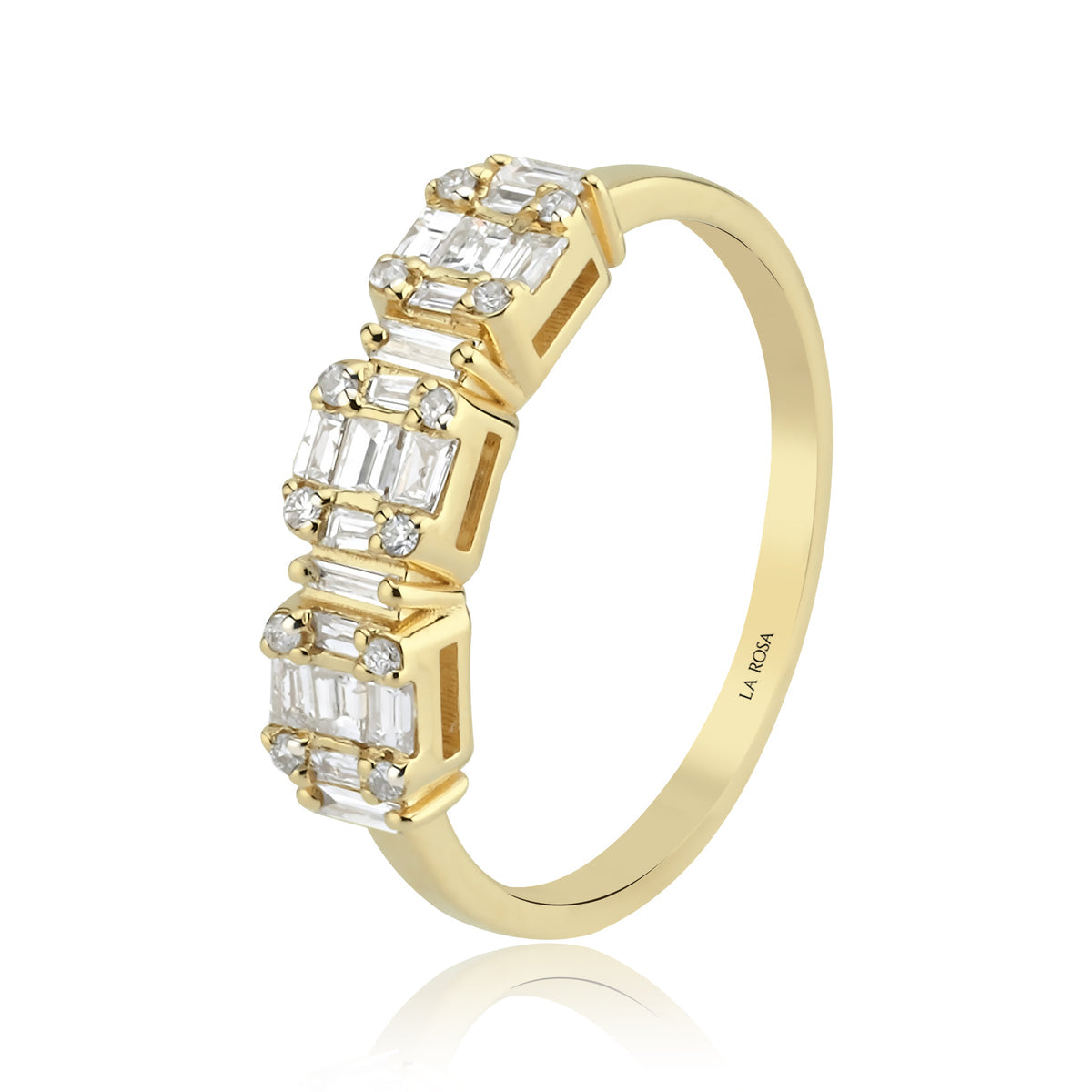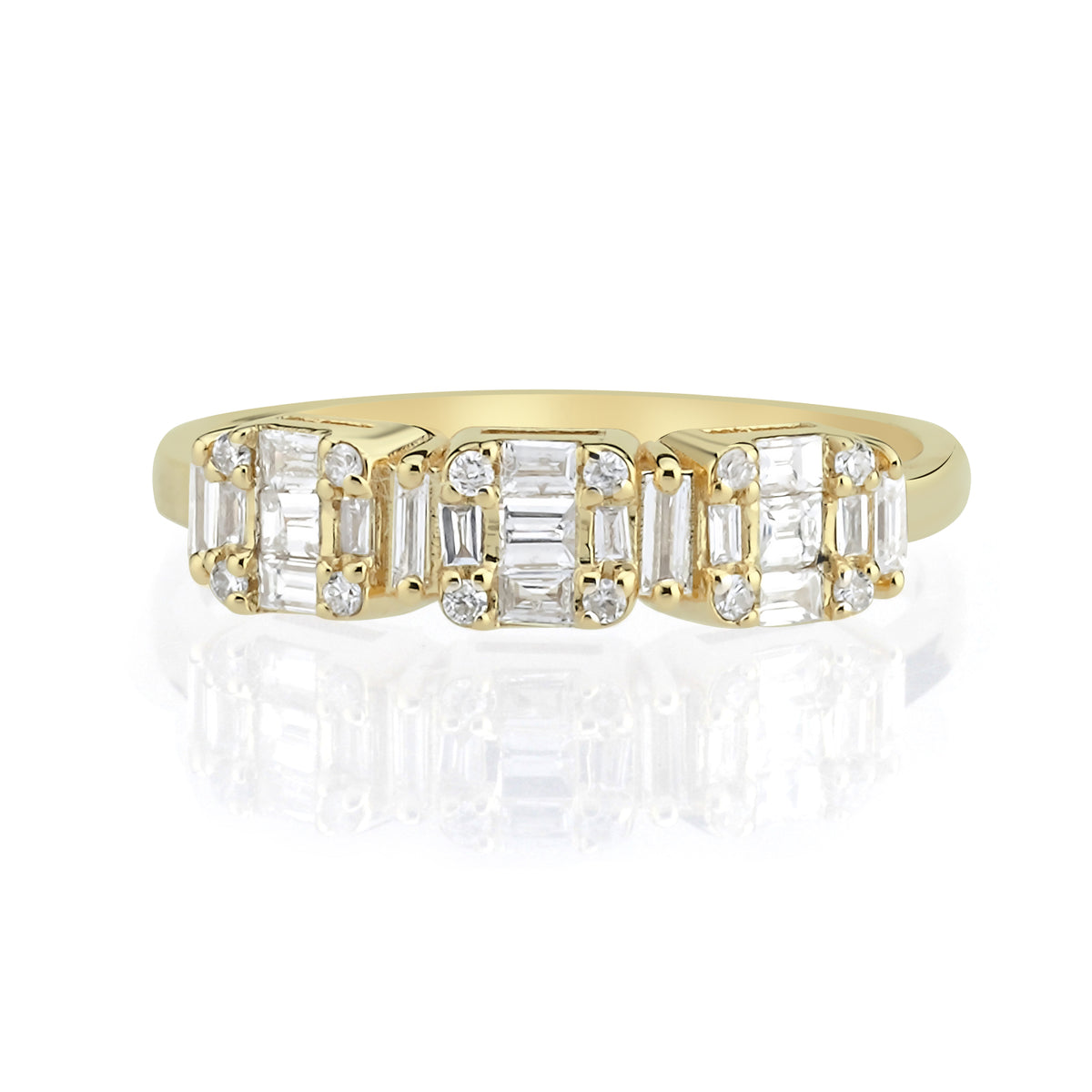 Bu eşsiz tasarım, altın zarafeti ve baget kesim pırlantaların büyüleyici ışığını bir araya getiriyor. Üç baget kesim pırlanta ve yuvarlak taşların mükemmel uyumuyla parmağınızda sofistike bir ışıltı sunar. 14 ayar altın üzerine işlenmiş 0.07ct ve 0.35ct pırlantalarla, özel anlarınıza eşlik edecek zamansız bir parça. "Golden Symphony", hem gündelik şıklık hem de özel günleriniz için vazgeçilmez bir tercih olacak.