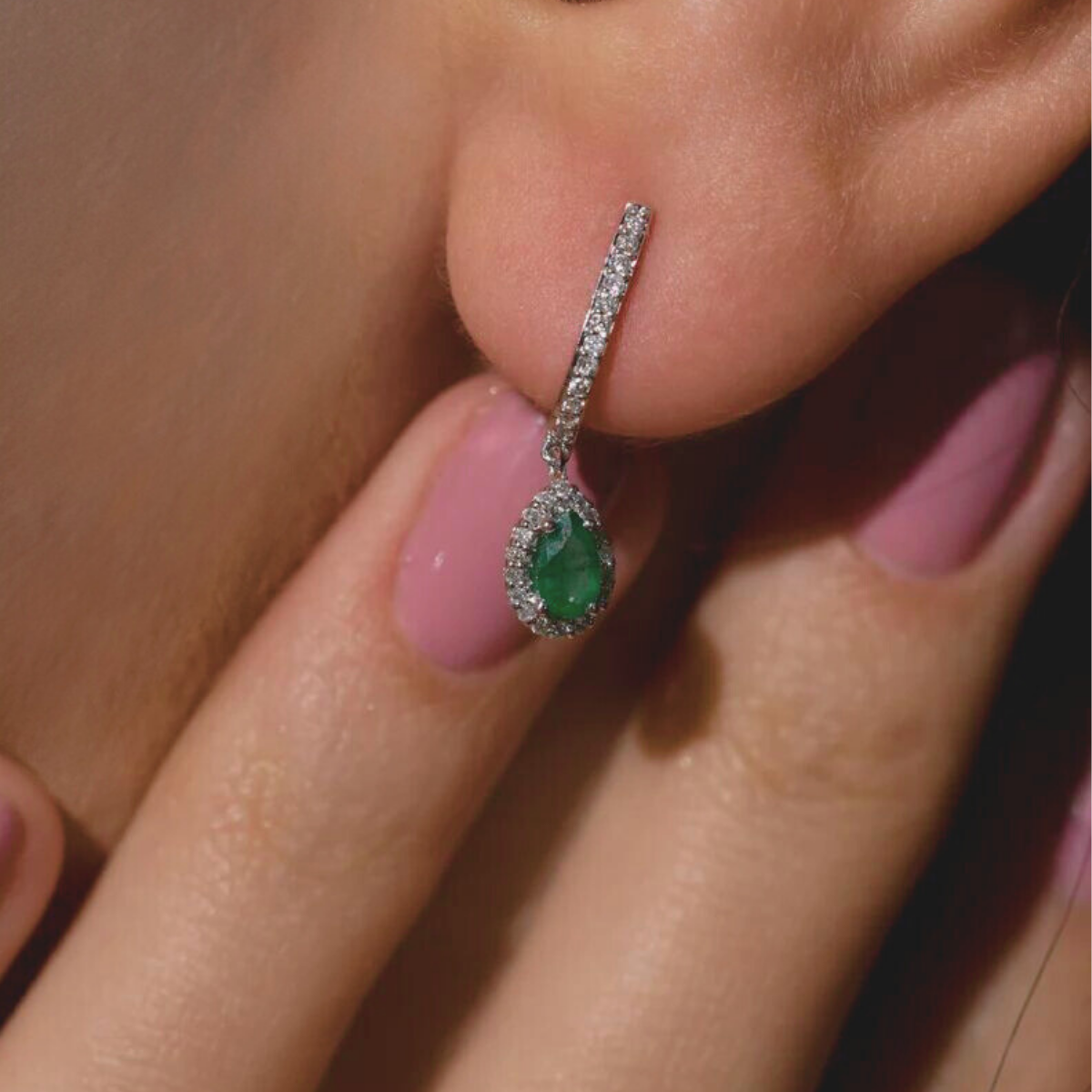 Gözyaşı Işıltısı Beyaz Altın Zümrüt ve Pırlanta Küpe