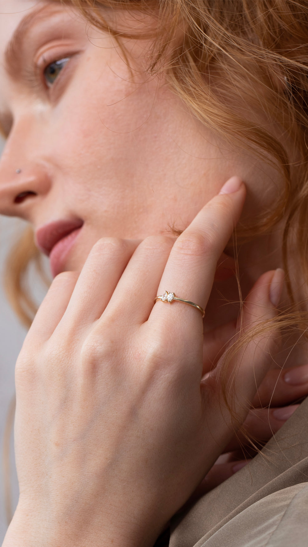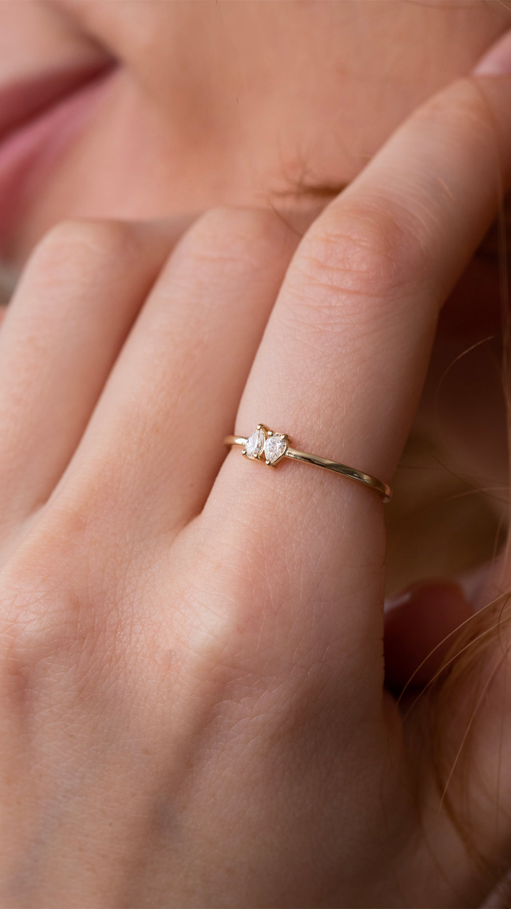 Bu zarif tasarım, Gözyaşı Pırlanta Altın Yüzük, adını sahip olduğu gözyaşı şeklindeki iki pırlantadan alıyor. 14 ayar sarı altından üretilen bu minimal yüzük, ince hatları ve pırlantaların ışıltısıyla sofistike bir görünüm sunuyor. İki gözyaşı kesim pırlanta, zarafetin sembolü olarak parmaklarınıza yansırken, tasarımındaki sadelik her tarza uyum sağlar.