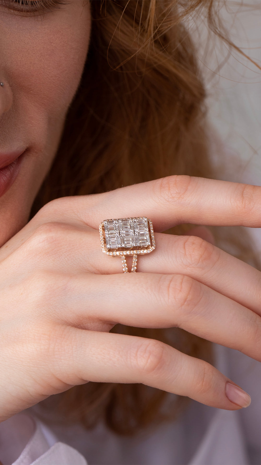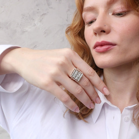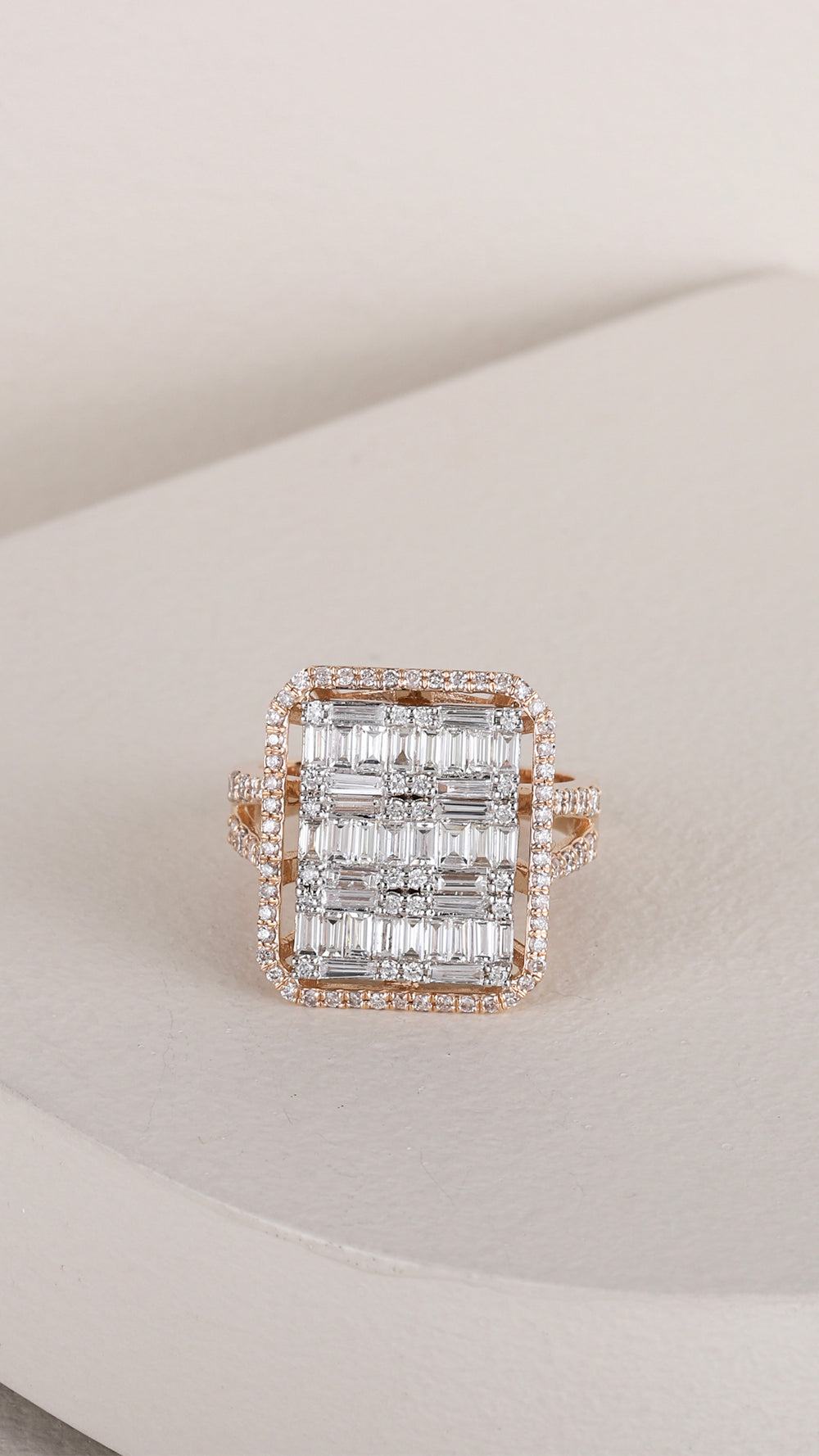 Adını, gün batımının büyüleyici tonlarından alan Gün Batımı Zarafeti Baget Rose Altın Yüzük, eşsiz bir şıklık ve zarafet sunar. Göz alıcı rose altın ile çevrelenen çok sıralı baget kesim pırlantalar, ışığın her açıdan büyüleyici bir şekilde yansımasını sağlar. Her bir detay, ince işçilikle işlenmiş olup yüzüğe sofistike bir görünüm kazandırır.
