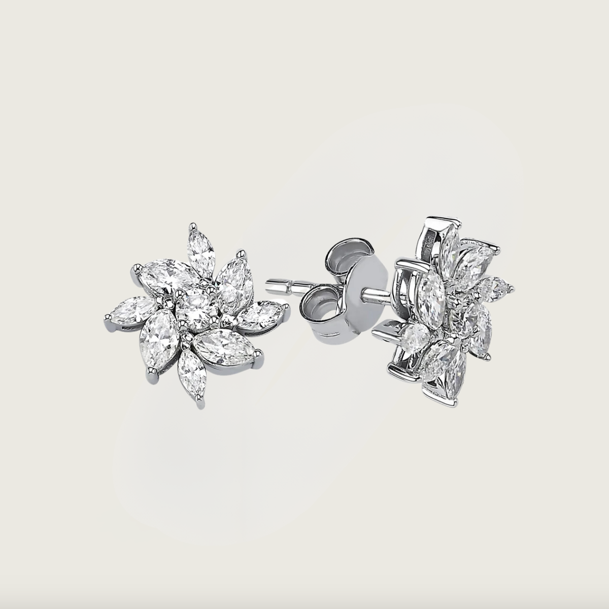 Güneşin parlaklığını yansıtan bu eşsiz tasarımlı çivili küpeler, 14 ayar beyaz altından yapılmış ve dikkat çekici marquise kesim pırlantalarla süslenmiştir. Çiçek formundaki dizilimi ile her açıdan zarif bir ışıltı sunan çivili küpeler, hem günlük kullanımda hem de özel davetlerde stilinize sofistike bir dokunuş katacaktır.