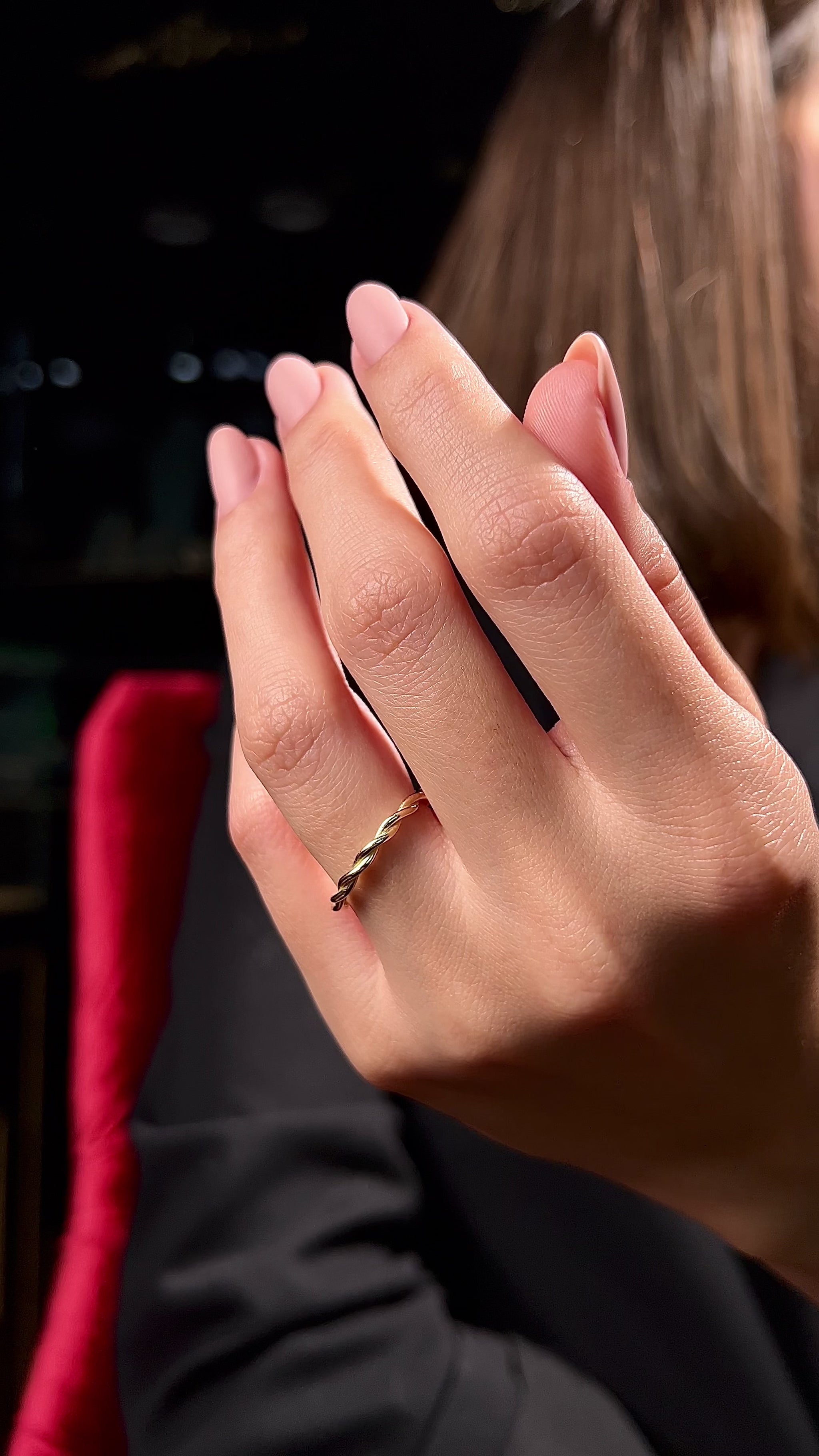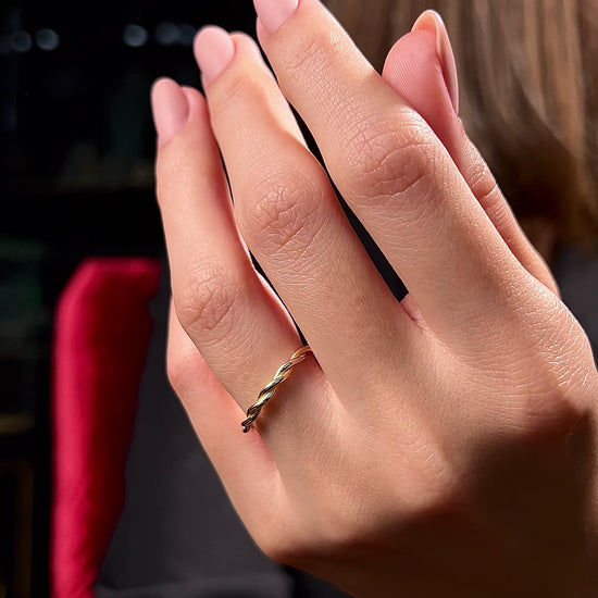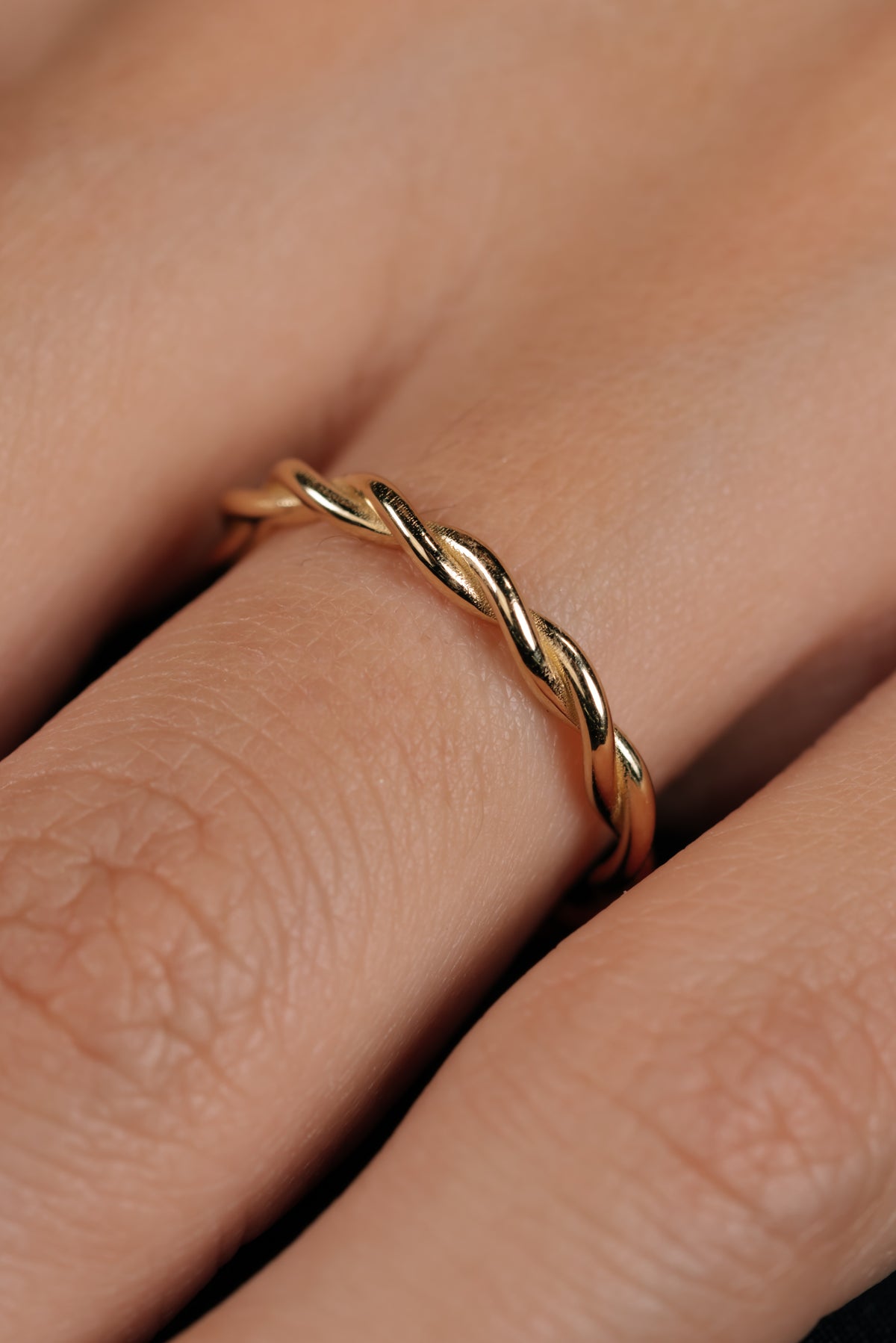 Bu 14 ayar altın yüzük, iki adet zarif örgü motifinin iç içe geçmesiyle tasarlanmış benzersiz bir parça sunar. İnce ve hafif yapısı, günlük kullanımda rahatlıkla tercih edilebilmesini sağlarken, modern bir şıklık sunar. Örgü detayı, yüzüğe doğal bir doku kazandırarak stilinizi ön plana çıkarır. Hem sade hem de dikkat çekici bir aksesuar arayanlar için mükemmel bir tercih olan bu yüzük, aynı zamanda alyans olarak da tercih edilmektedir.