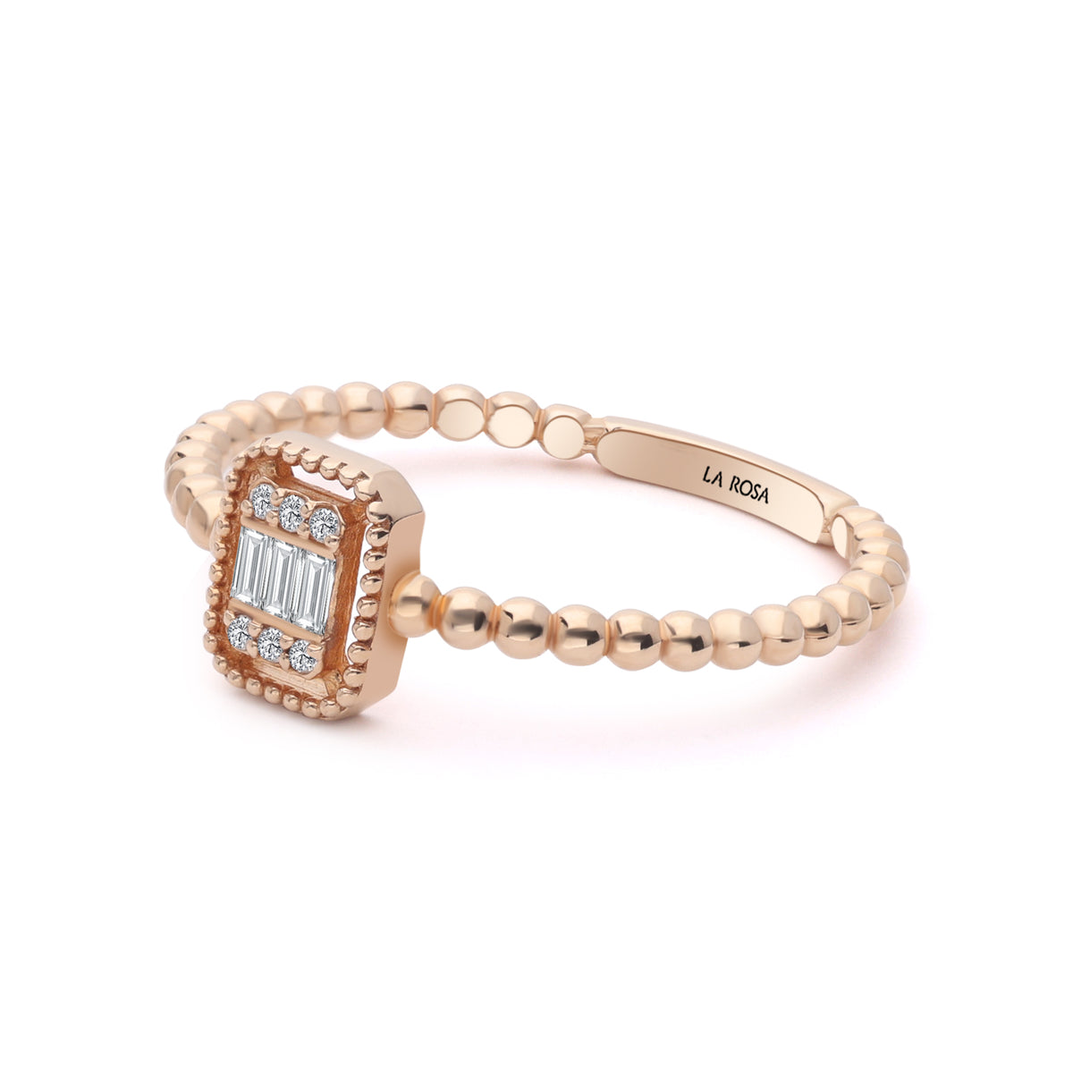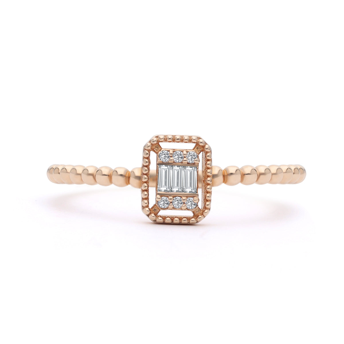 Baget kesim pırlantaların şıklığını zarif dokularla buluşturuyor. Yüzüğün orta kısmında yer alan baget pırlantalar, çevresindeki ince yuvarlak detaylarla çerçevelenerek modern ve sofistike bir görünüm sunuyor. Günlük stilinize estetik bir dokunuş katmak veya özel anlarınızı unutulmaz kılmak için tasarlanan bu özel parça, sadeliği ve zarafeti bir araya getiriyor.