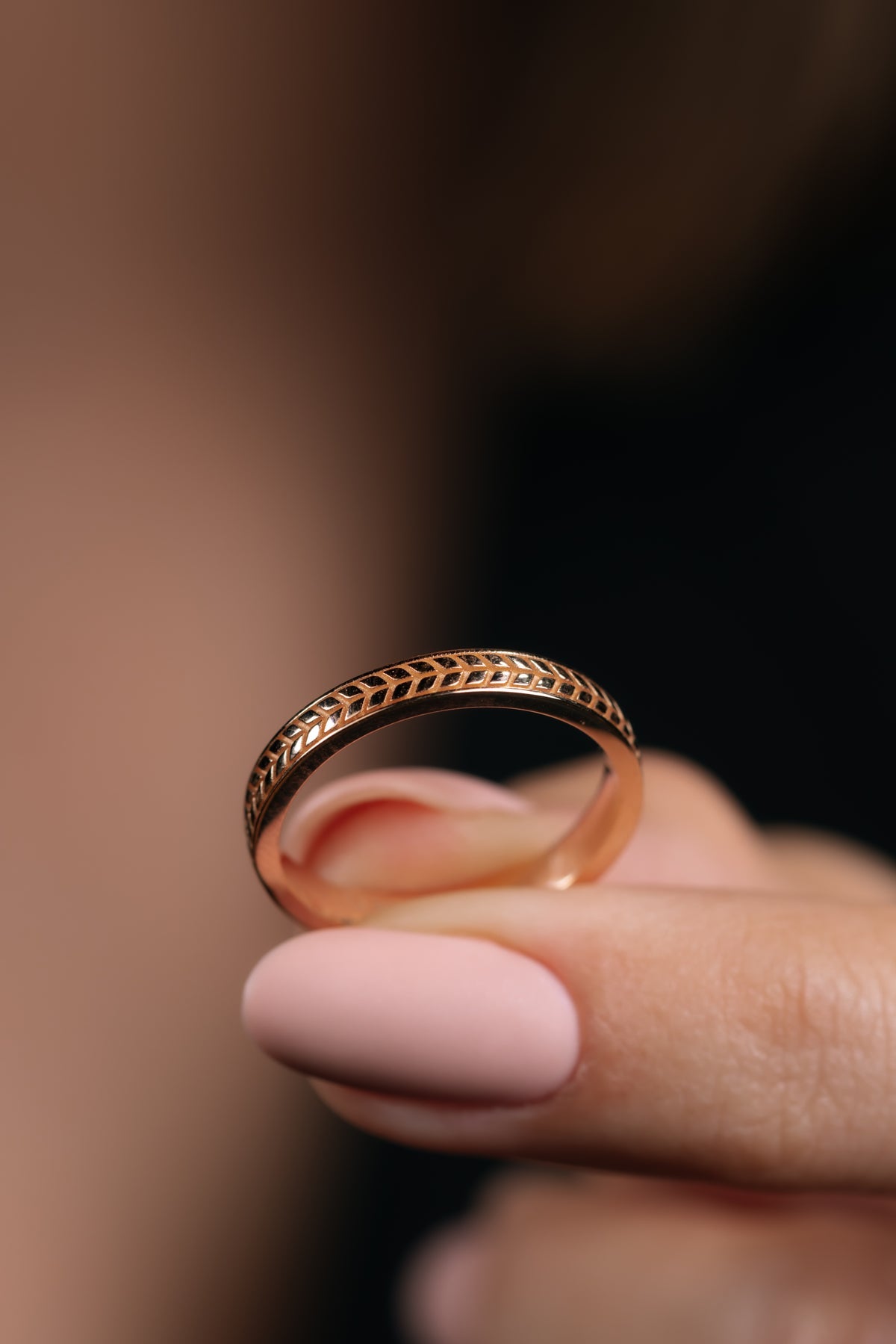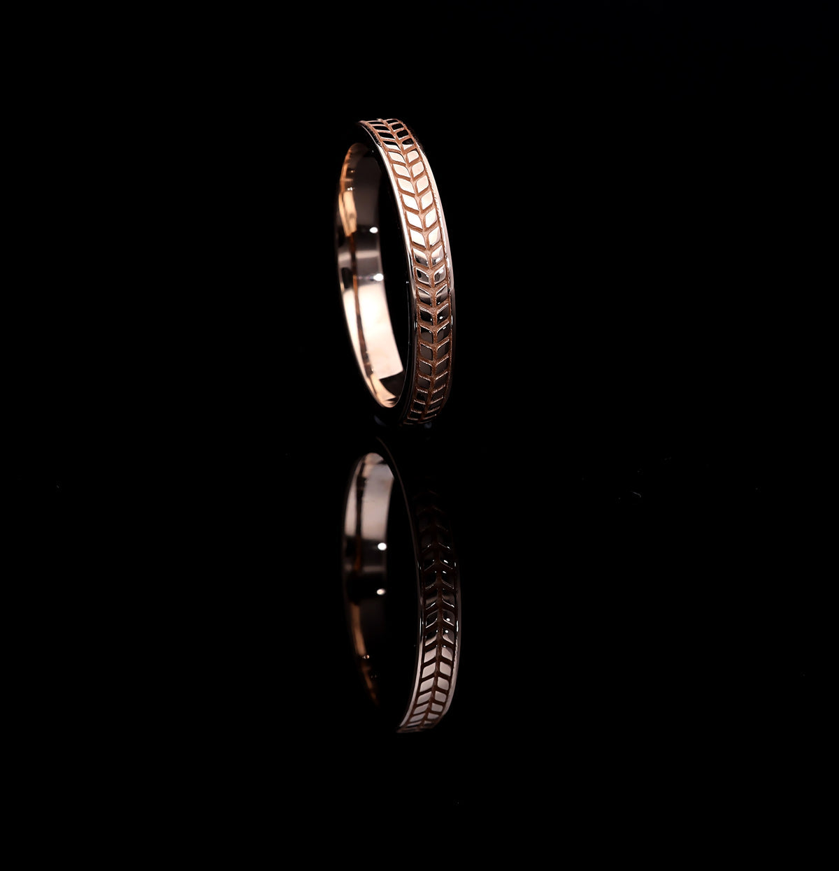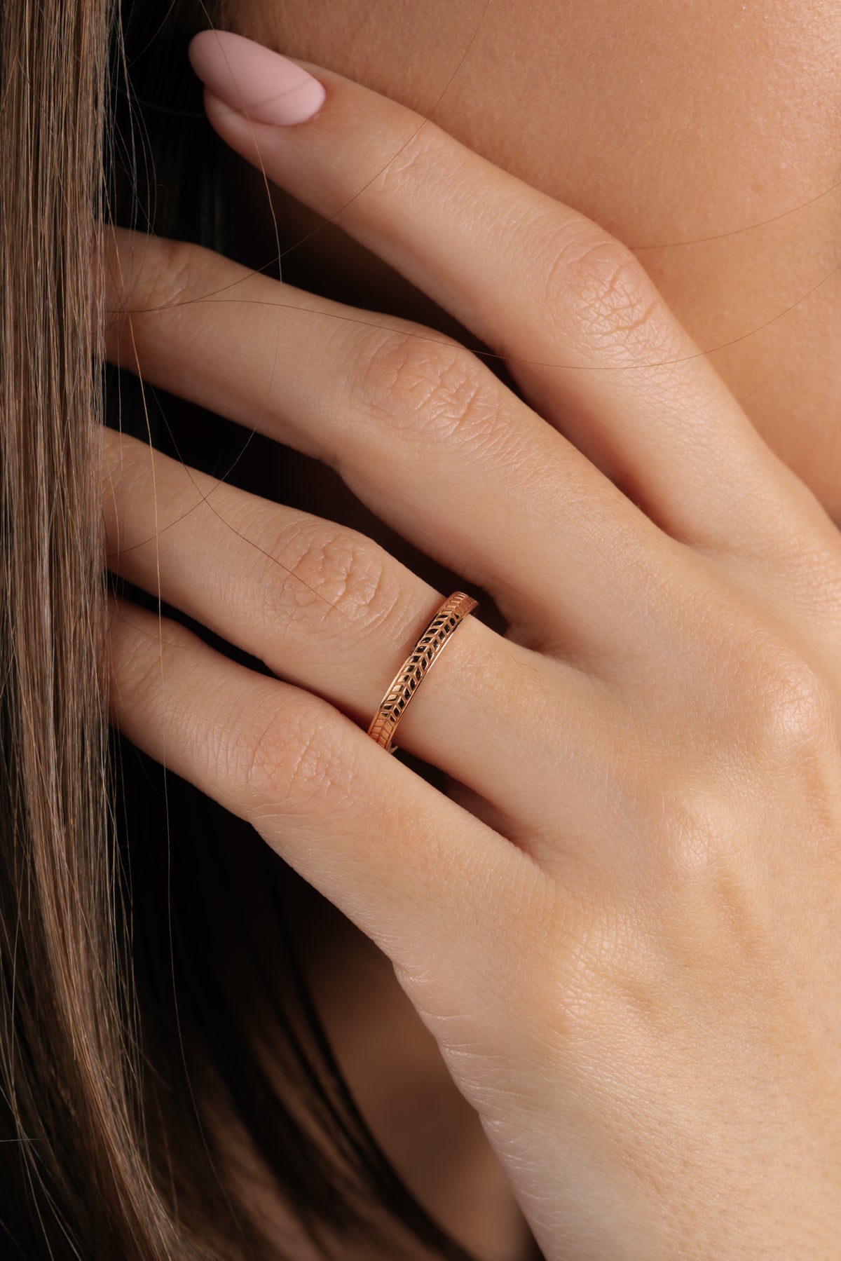 Rose altın ile işlenmiş bu ince yüzük, zarif geometrik desenleriyle modern ve sofistike bir görünüm sunar. Günlük kullanımda sıcak tonları ve sade yapısıyla doğal bir şıklık arayanlar için ideal olan bu yüzük, aynı zamanda alyans olarak da tercih edilmektedir. Hem rahatlığı hem de zamansız şıklığı bir araya getiren bu tasarım, stilinize ince bir dokunuş katar.