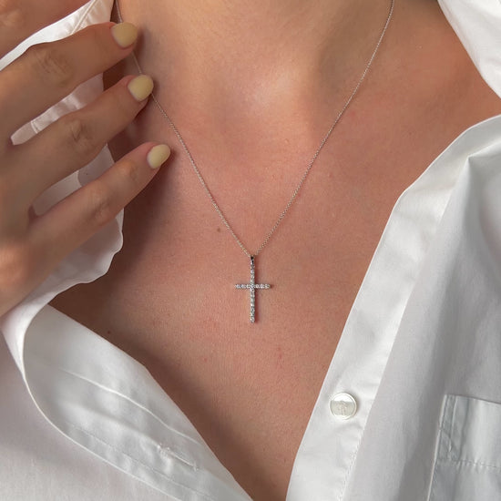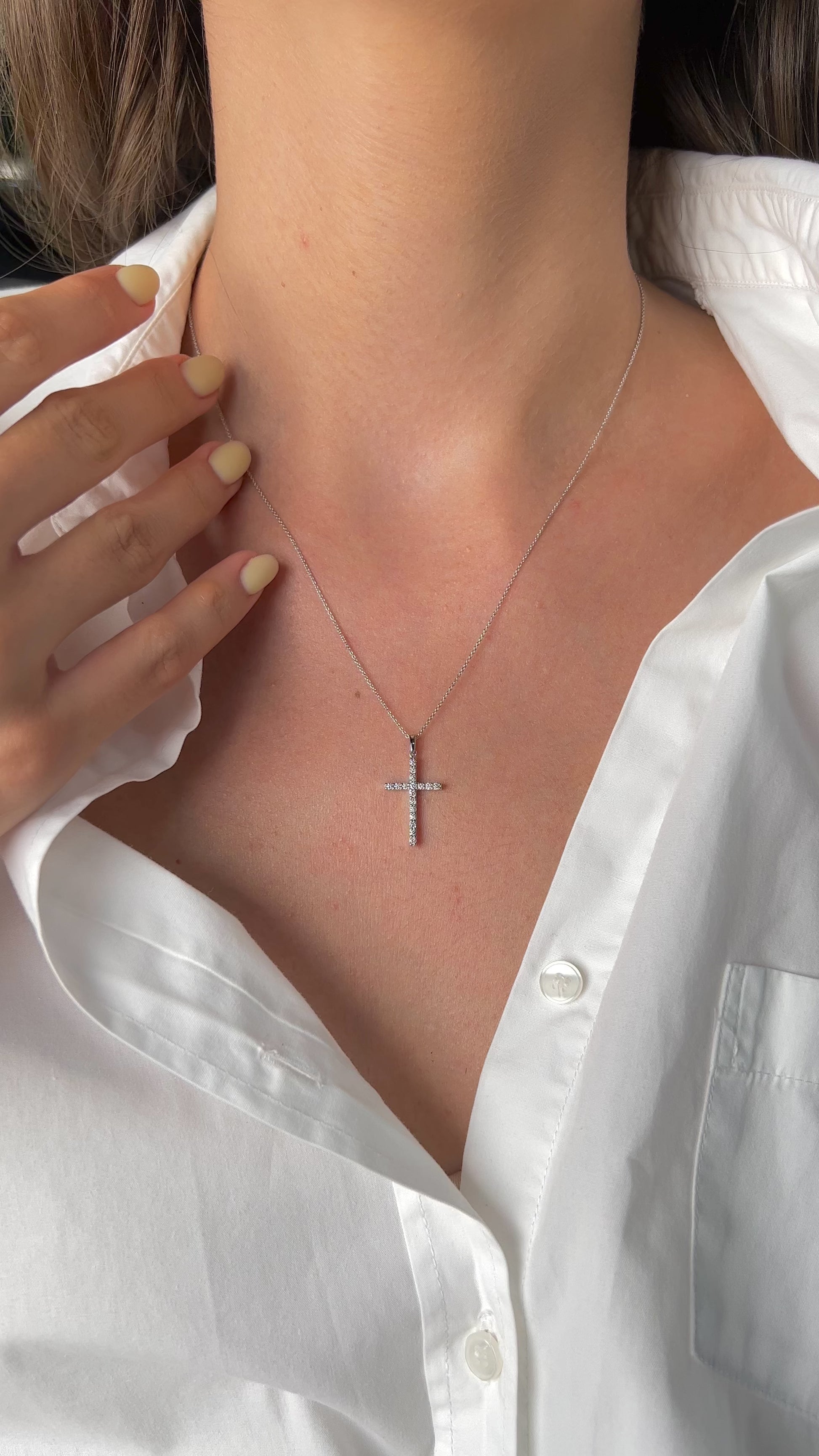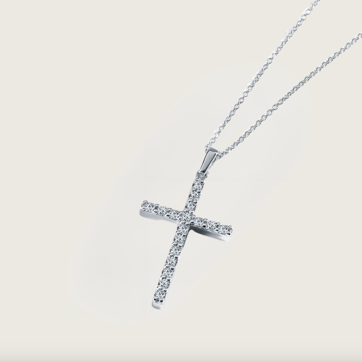 Beyaz altın ve pırlantanın zarif birleşimiyle tasarlanmış bu haç kolye, klasik ve modern tarzı bir araya getiriyor. Parlak pırlanta taşlarla bezeli haç figürü, günlük şıklığınıza anlam katan bir dokunuş sunuyor. Kendinizi ya da sevdiklerinizi özel hissettirecek bu kolye, her tarza uyum sağlayacak şekilde tasarlandı.