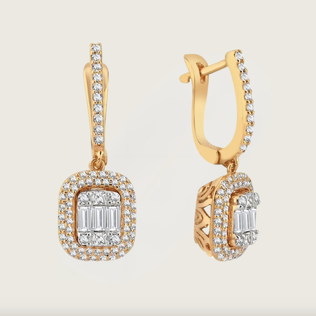 Dış yüzeyini saran parlak yuvarlak kesim pırlantalar ve zarif baget kesim pırlantaların birleşimiyle bu şık küpe, her anınızı daha özel kılacak. 0.39 ve 0.55 karat pırlantaların birleşimiyle göz kamaştırıcı bir parlaklık sunar. Özel günlerde veya günlük kullanımda tarzınıza sofistike bir dokunuş katacak bu zarif küpe, konforlu yapısıyla uzun süreli kullanım için de idealdir.