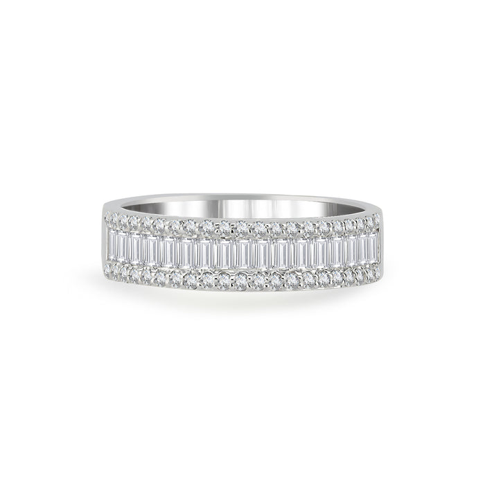 Yarımtur kullanımı, yüzüğün zarif bir denge içinde olmasını sağlar ve baget kesimin saf ışıltısını ortaya çıkarır. Bu yüzük, sade ama etkileyici bir görünüm sunarken, ışığı her açıdan yansıtarak parmağınıza sofistike bir ışıltı katıyor.