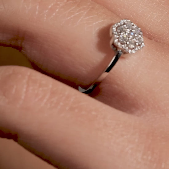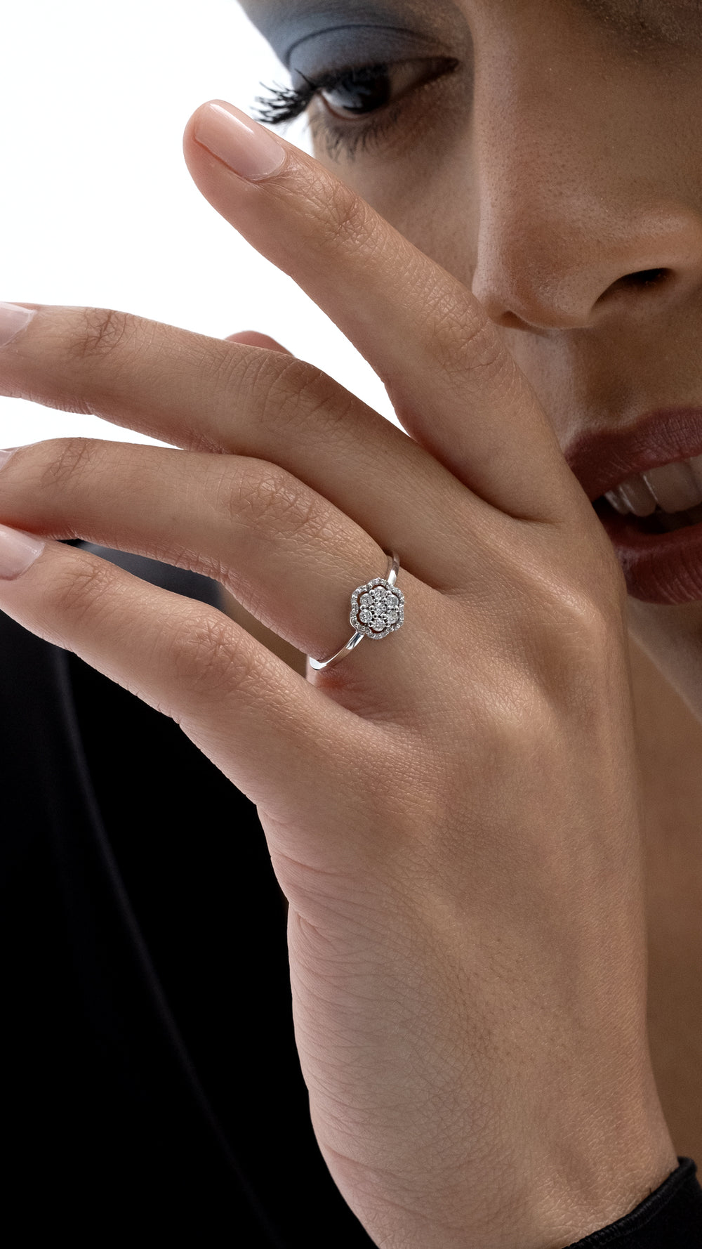 Yüzüğün sade ve zarif formu, pırlantaların etkileyici parlaklığıyla birleşerek minimal bir şıklık yaratıyor.
