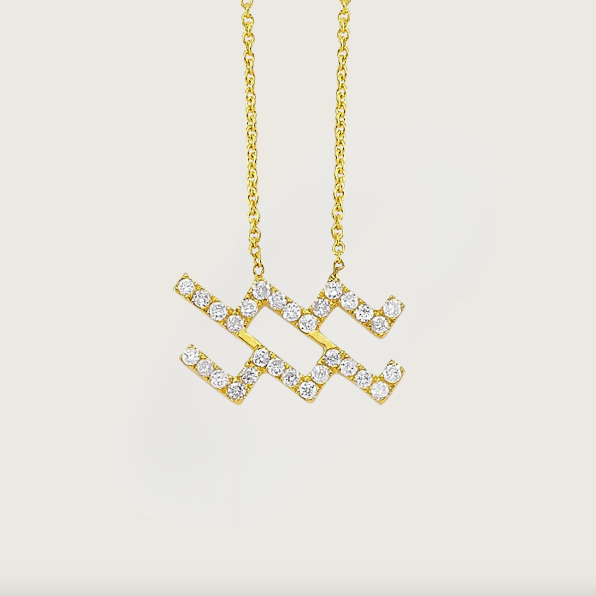 Kova burcunun özgün ve yaratıcı ruhunu yansıtan bu pırlanta kolye, modern ve zarif tasarımıyla dikkat çekiyor. Özenle işlenmiş pırlanta taşlarıyla detaylandırılmış sembol, Kova burcunun enerjisini ve karakteristik özelliklerini vurgulamak için tasarlandı.