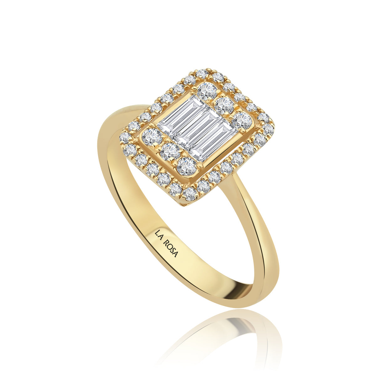 Sarı altın üzerine işlenmiş bu eşsiz yüzük, kraliyet mücevherlerinin ihtişamını ve zarafetini yansıtıyor. Kare formundaki baget pırlantalar ve çevresini saran ışıltılı yuvarlak pırlantalar, bu yüzüğü adeta bir kraliyet tacı haline getiriyor. La Rosa'nın zarif tasarım anlayışıyla hayata geçen bu parça, sarı altının sıcaklığı ve pırlantaların göz alıcı parıltısıyla stilinize lüks bir dokunuş katıyor. Hem özel günlerinizde hem de günlük stilinizde zarafetin ve şıklığın simgesi olacak bu yüzük, kraliyet ışıltısını parmağınıza taşıyor.