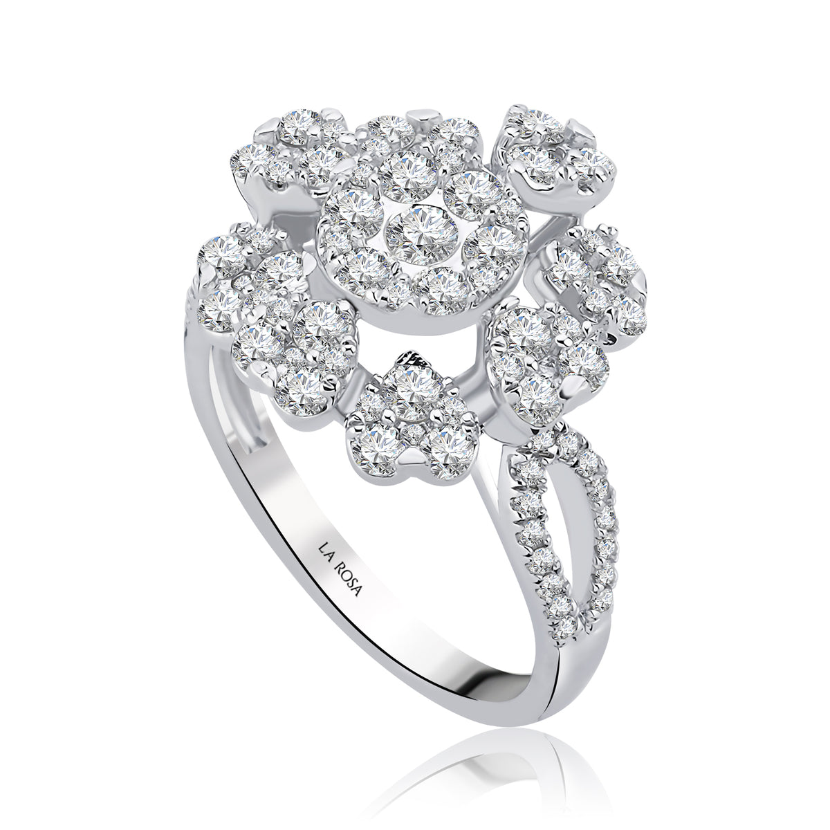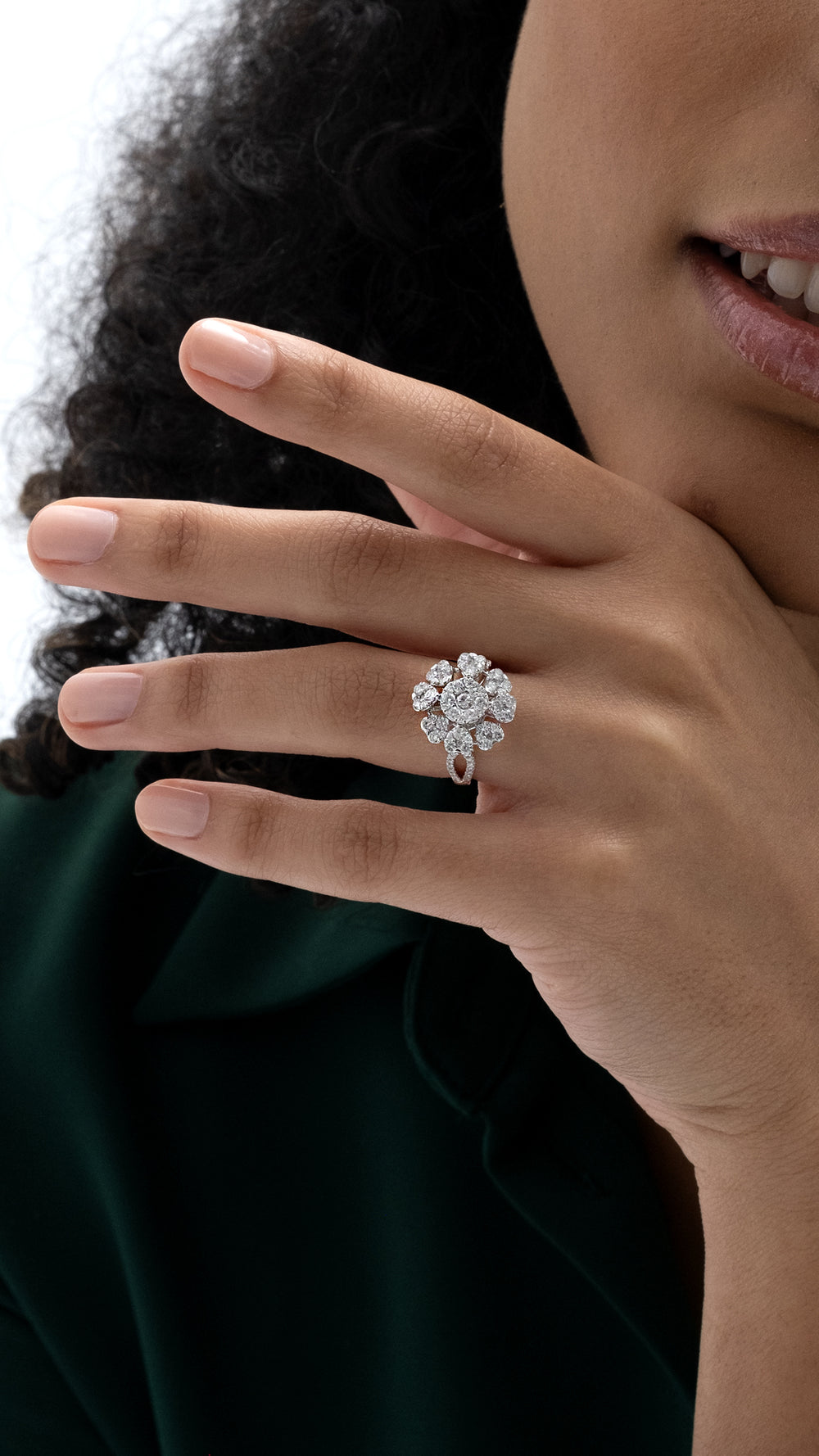 Bu büyüleyici tasarım zarif çiçek motifleri ve göz alıcı pırlantalarla adeta kraliyet ihtişamını yansıtır. Pırlantaların detaylı işçiliği, yüzüğe hem klasik hem de lüks bir hava katarken, çiçek formu ile doğanın zarafetini taçlandırıyor. İhtişamlı duruşuyla özel davetlerde, nişan ve düğünlerde mükemmel bir tamamlayıcı olacak bu yüzük, her anınızda size kraliçe gibi hissettirecek.