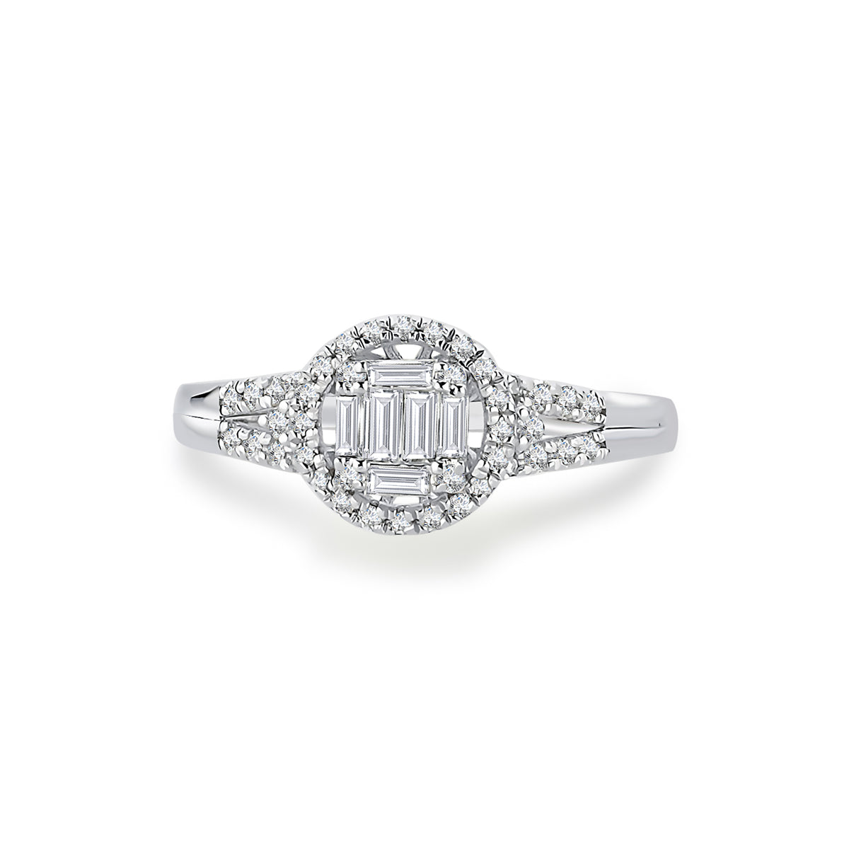 Merkezdeki dikkat çekici baget kesim taş, etrafındaki ince işçilikle yerleştirilmiş pırlantalarla çevrelenerek göz alıcı bir parıltı sunuyor. Hem klasik hem modern çizgilerle tasarlanan bu yüzük, asil duruşu ve detaylı işçiliğiyle her anınıza kraliyet zarafeti katacak. Nişan, evlilik teklifi veya özel günler için mükemmel bir tercih olan bu yüzük, sonsuz aşkı ve bağlılığı temsil ediyor.