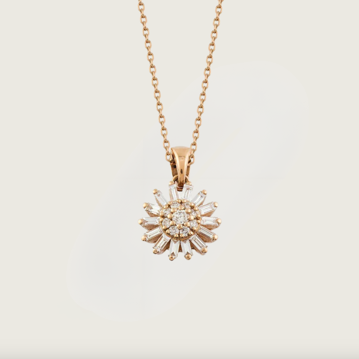 La Rosa’nın Baget Koleksiyonu’ndan ilham alan bu zarif çiçek figürlü kolye, doğanın en saf ve zarif çiçeklerinden olan gülün güzelliğini ve sadeliğini pırlantalarla buluşturuyor. 14 ayar pembe altınla tasarlanan kolye, 0.13 karat baget kesim ve 0.05 karat yuvarlak kesim pırlantalarla ışıltısını gözler önüne seriyor. Her adımda ışığı yansıtarak, zarif bir duruş ve şıklık sunar.