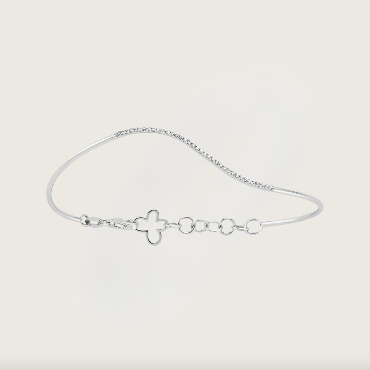 Bu bileklik, beyaz altının zarif ışığı ve yuvarlak kesim pırlantaların eşsiz parıltısıyla, gökyüzünün büyüleyici huzurunu yansıtan bir tasarıma sahiptir. 14 ayar beyaz altından yapılmış olup, pırlantalar toplamda 0,13 karat ağırlığındadır. Modern çizgilerle doğadan ilham alan bu zarif bileklik, özel günlerin vazgeçilmez tamamlayıcısı olacak.