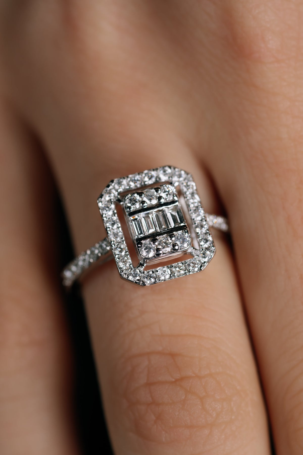 Yüzüğün merkezinde yer alan baget pırlanta, ışığı adeta bir prizma gibi yakalayıp büyüleyici bir ışıltıyla geri yansıtır. Keskin ve net çizgileriyle dikkat çeken bu değerli taş, her açıdan göz alıcı bir parıltı sunar. Pırlantanın kusursuz berraklığı ve zarafeti, tasarıma eşsiz bir derinlik kazandırırken, zarif dokunuşlarıyla öne çıkar.