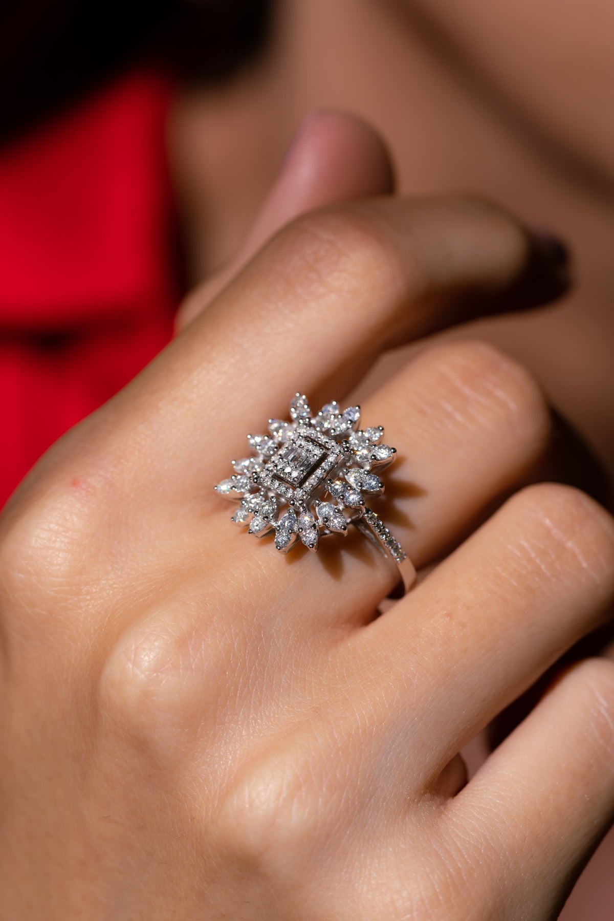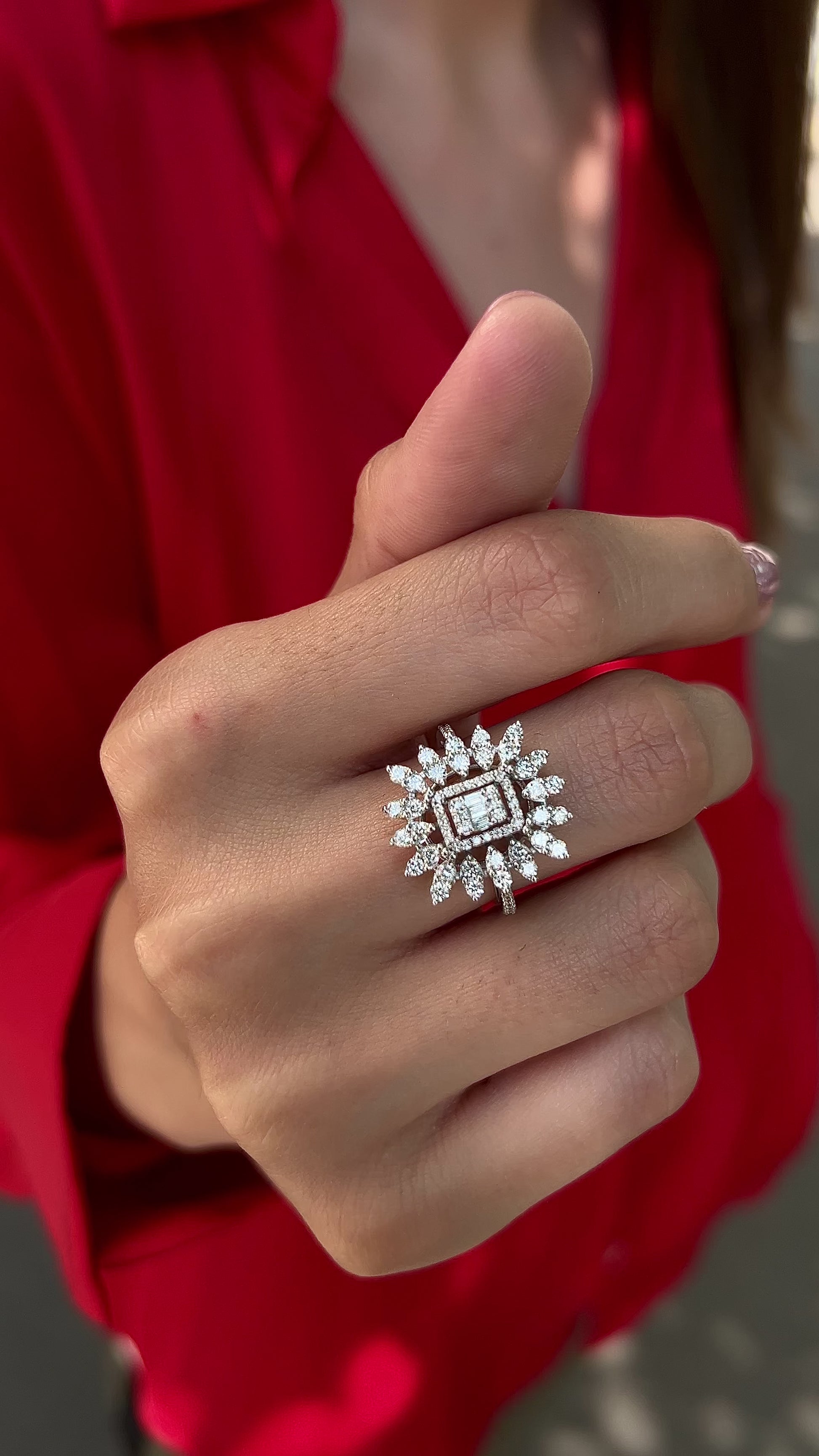 Çiçeklerden ilham alan zarif ve ihtişamlı tasarımıyla göz alıyor. Işıltılı baget kesim taşlar, markiz kesim pırlanta, floral detaylarla çevrelenerek doğadan esinlenmiş bir şıklık yaratıyor. Yüzüğün eşsiz tasarımı, her hareketinizde ışığı yansıtarak göz kamaştırıcı bir parıltı sunuyor. Hem özel günlerde hem de günlük hayatta stilinize etkileyici bir dokunuş katacak.