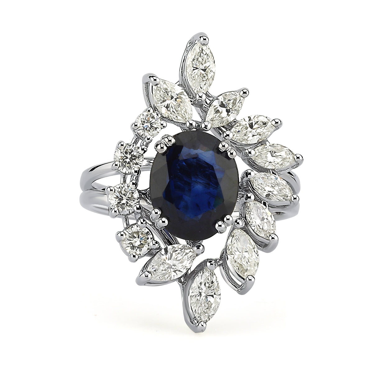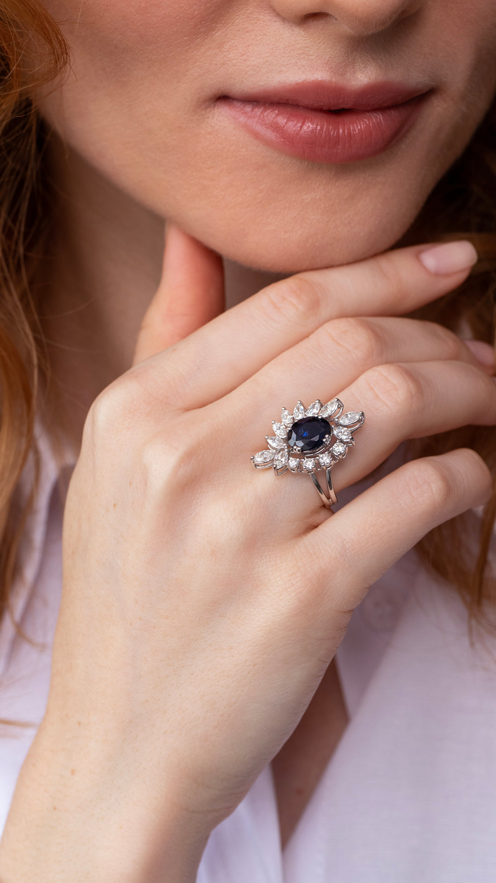 Zarafetin ve lüksün mükemmel birleşimini sunuyor. Bu eşsiz tasarım, derin mavi safir taşının etrafında özenle dizilmiş pırlantalarla çerçevelenmiştir. Her bir pırlanta, taşın ışıltısını artırarak parıldamasını sağlarken, safirin yoğun rengi ile mükemmel bir kontrast oluşturur.