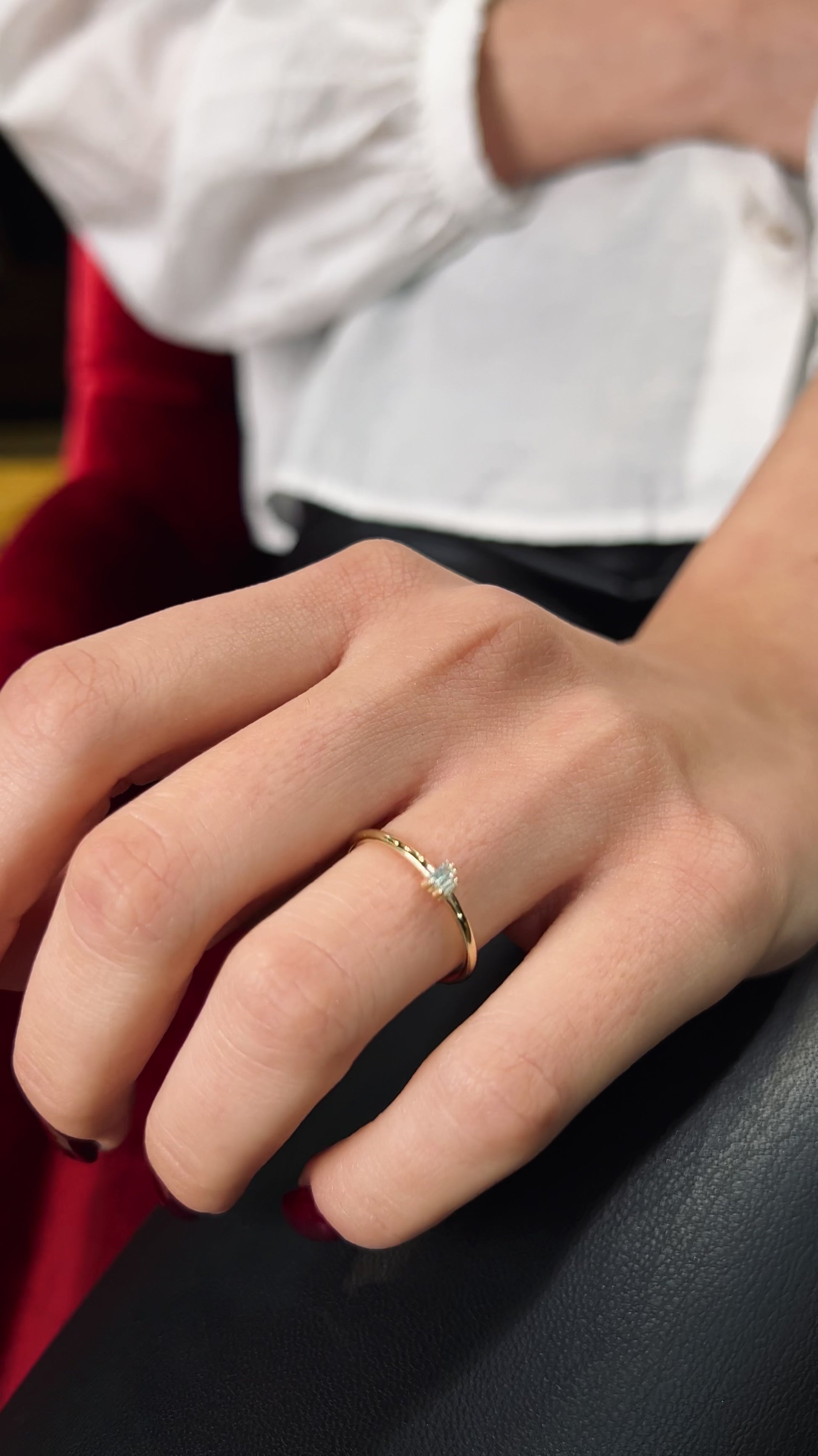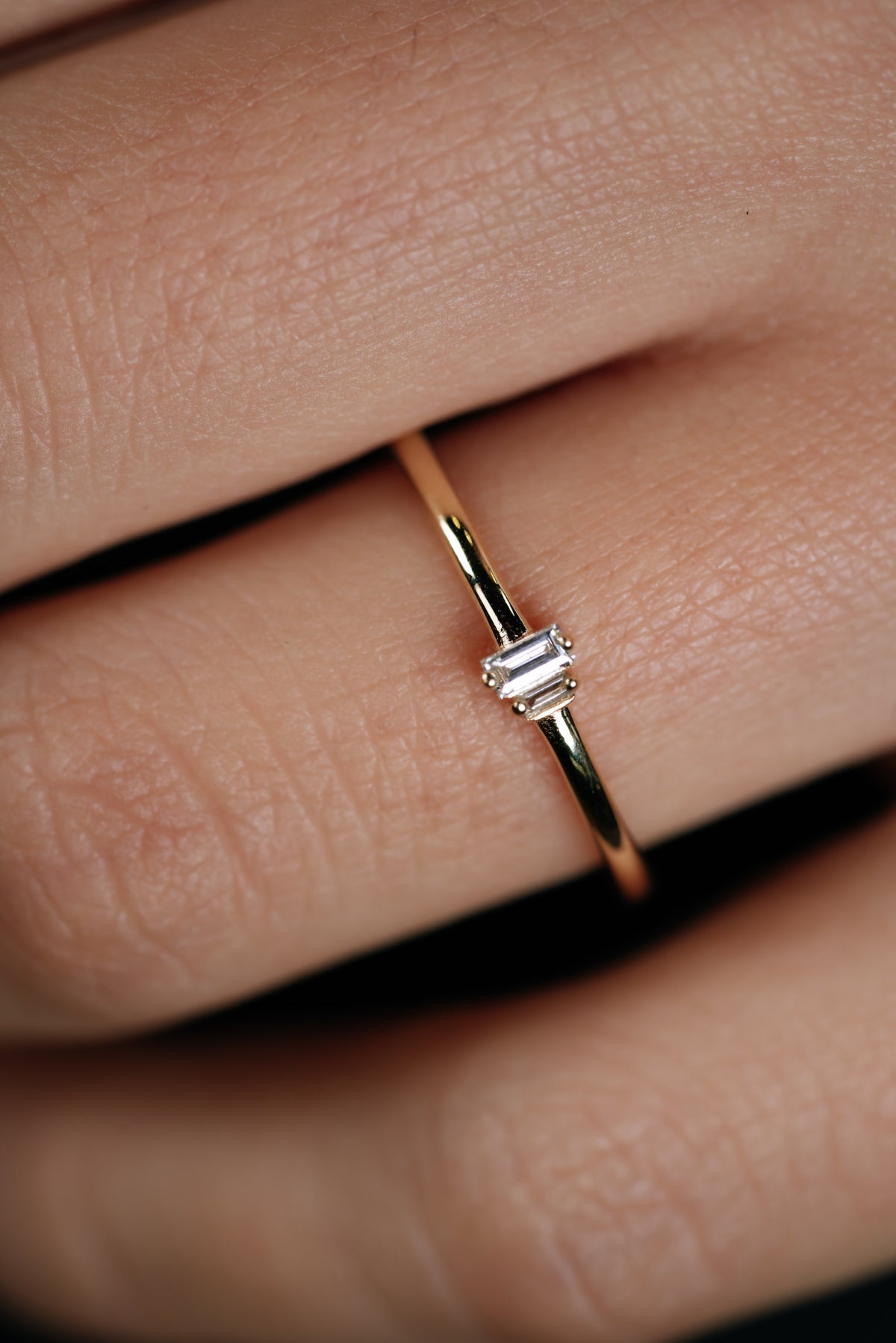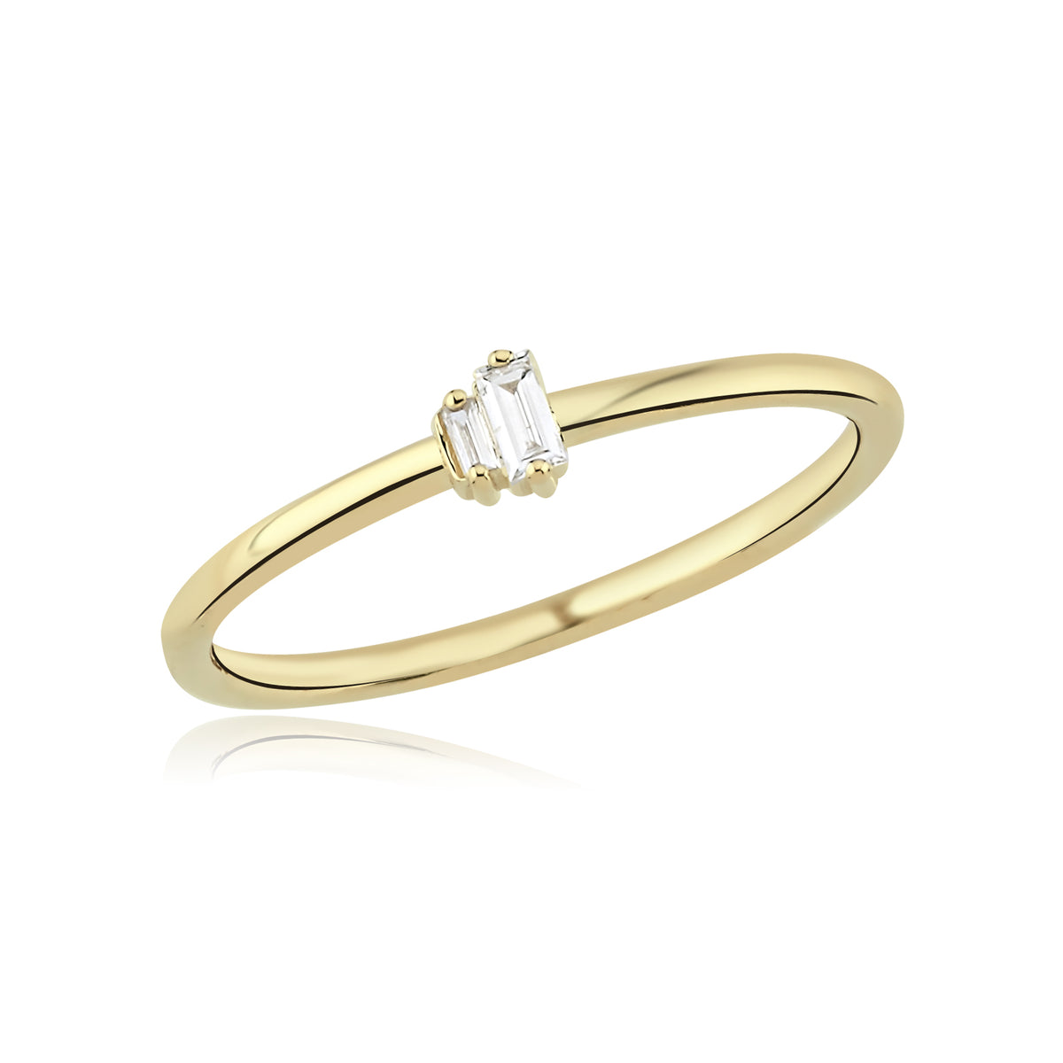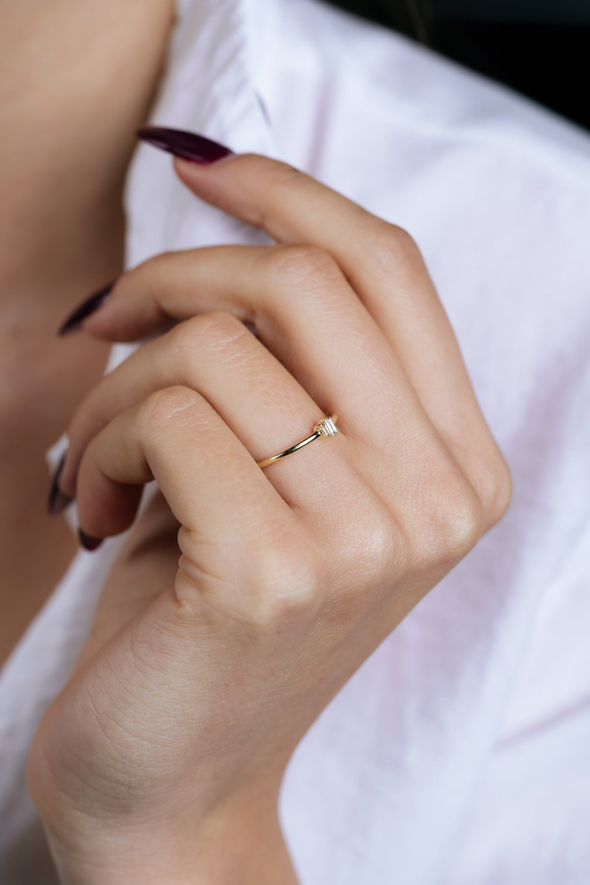 İki adet zarif baget kesim pırlantası, yüzüğün ince altın bandıyla mükemmel bir uyum içerisindedir. Bu minimal detaylar, günlük şıklığınızı tamamlayan zarif bir dokunuş katar.