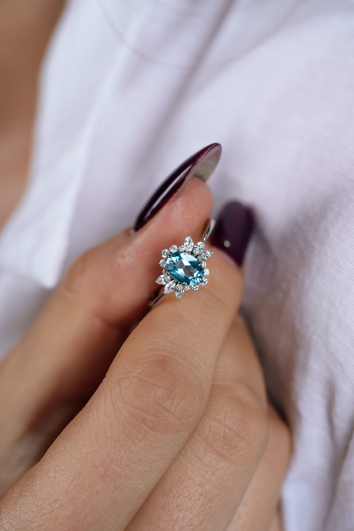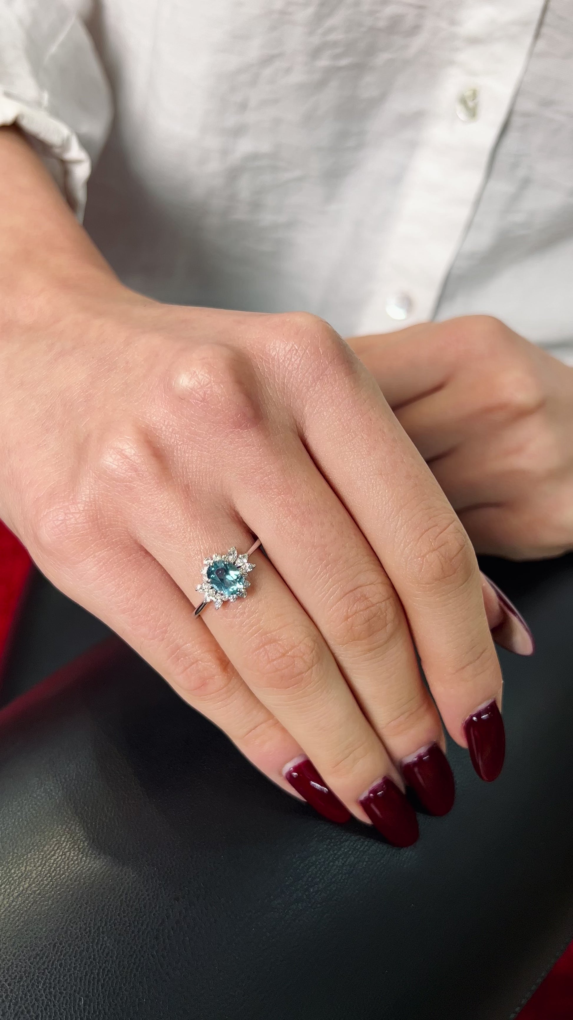 Oval Mavi Topaz ve Pırlanta Beyaz Altın Yüzük