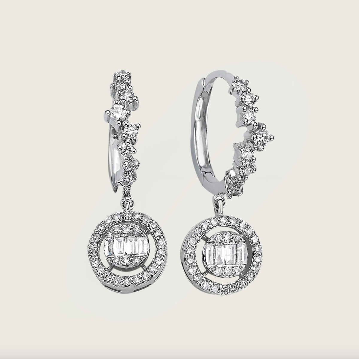 Bu zarif halkalı pırlanta küpeler, 14 ayar beyaz altın ile tasarlanmış ve ışıltılı pırlantalarla bezenmiştir. Her hareketinizde ışığı yansıtan yuvarlak formu ve zarif detaylarıyla, Parıltı Halkası küpeler her anınıza şıklık katacak. Gündelik stillerinizde veya özel gecelerde takabileceğiniz bu parçalar, zarafetinizi ön plana çıkaracak ve dolabınızın en özel mücevherlerinden biri olacak.