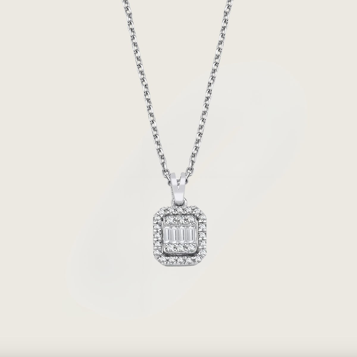 Merkezinde yer alan üçlü baget kesim pırlantaları ve çevresindeki yuvarlak pırlanta detaylarıyla modern ve sofistike bir stil sunuyor. Hem günlük stilinizle hem de özel gecelerde tercih edebileceğiniz bu şık kolye, her anınıza ışıltı katacak zarafetiyle dikkat çekiyor.