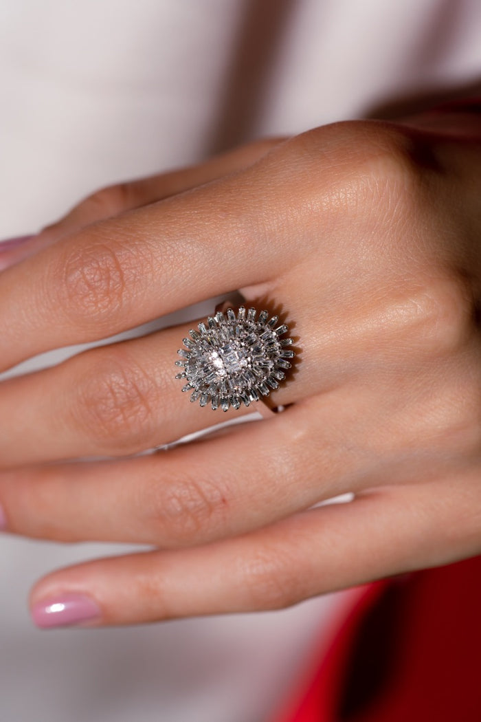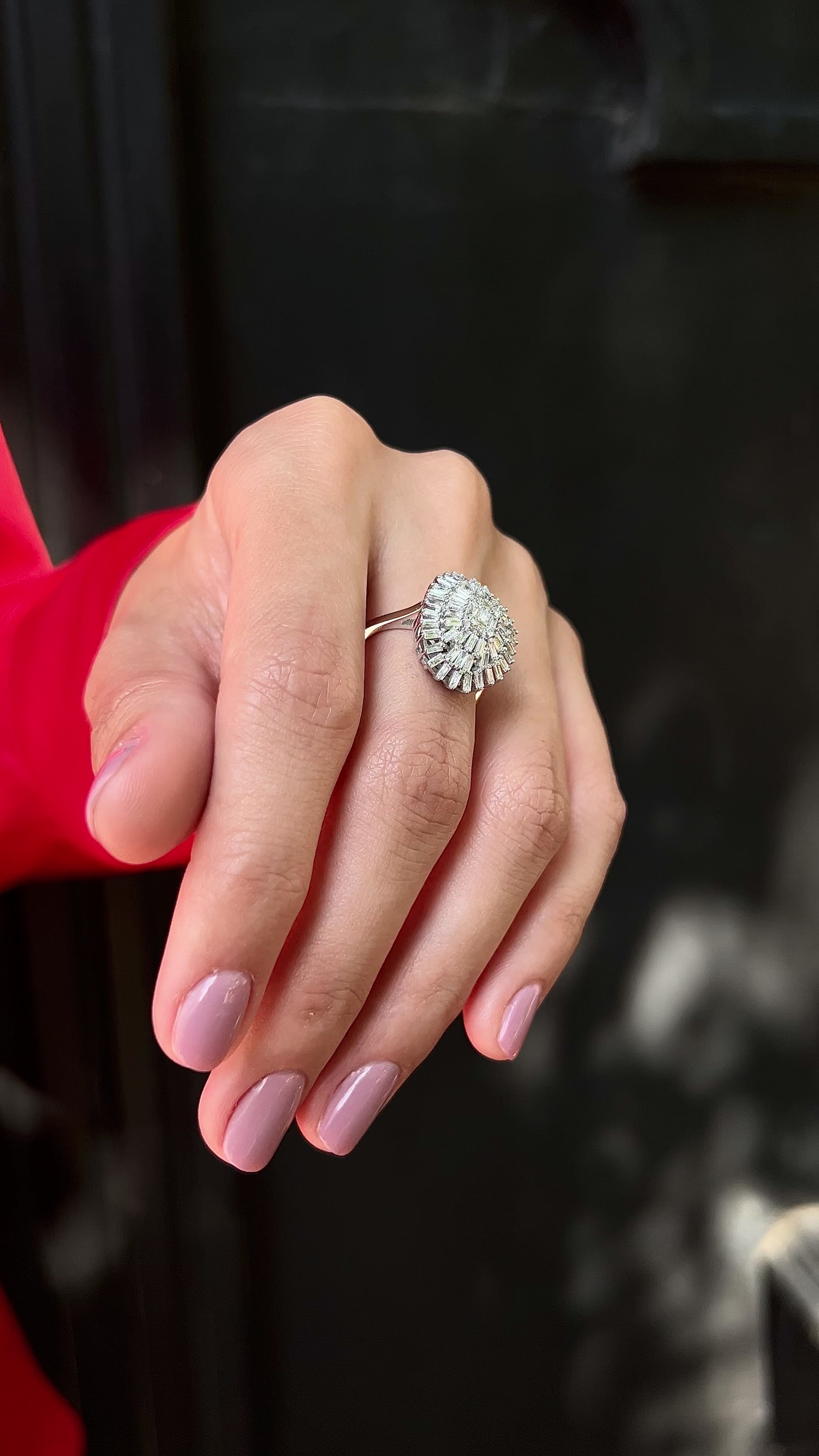 Queen Baget Pırlanta Yüzük, zarafetin ve ihtişamın simgesi olarak tasarlandı. Merkezden dışa doğru yayılan baget kesim pırlantalar, yüzüğe adeta bir taç formu kazandırırken, her bir parıltı göz kamaştırıcı bir ışıltı sunar. Eşsiz işçiliği ve detaylarıyla, bu yüzük her anınıza lüks ve zarafet katacak. Beyaz altının göz alıcı parlaklığı ile birleşen pırlantalar, tüm dikkatleri üzerinize çeker.